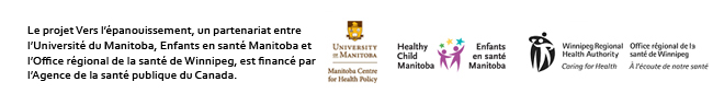 Le projet Vers l’épanouissement est le produit d’un partenariat entre Enfants en santé Manitoba, l’Office régional de la santé de Winnipeg et l’Université du Manitoba qui vise à promouvoir le bien-être des parents et des enfants dans le cadre du programme manitobain Les familles d’abord.