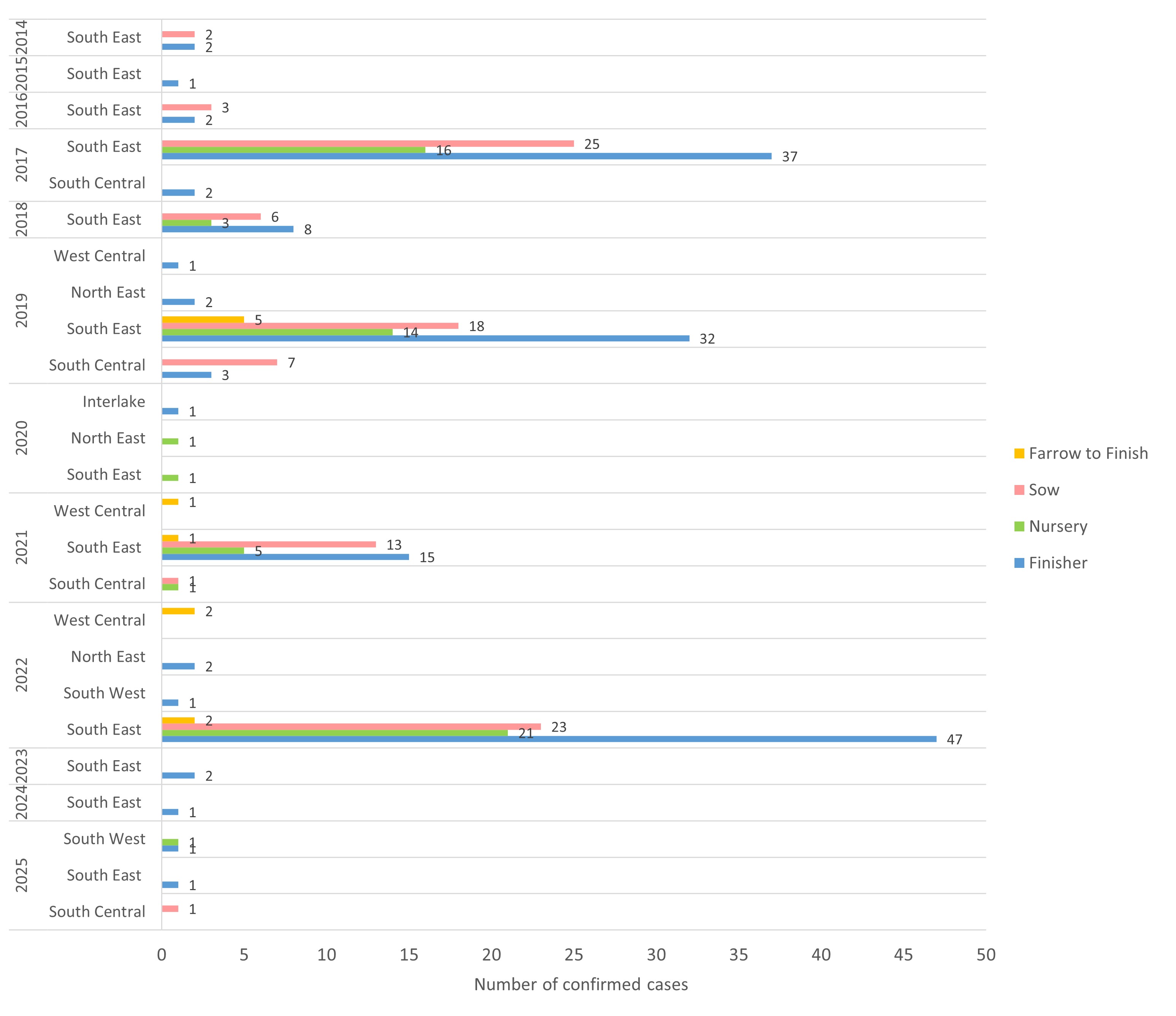 As of January 14, 2026, a total of 334 cases at 186 premises in Manitoba have previously been confirmed to have PED. Most premises have only had one occurrence of infection, but several have had recurring instances of infection.
