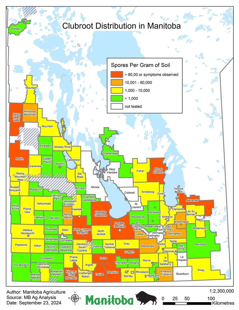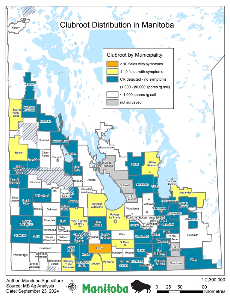 As less than 10% of farms in Manitoba have been sampled, it is recommended that all fields be tested to determine if clubroot spores are present, regardless of RM classification.