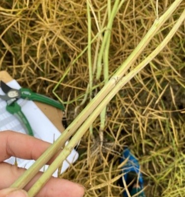 Early signs of striping should bring you back to the field to take samples at swathing or post-harvest. Walk fields when the stems begin to dry and peel. Pull suspect stems and check for peeling skin with black specks and cut at the base to see if there are grey cross‑sections. If identification is uncertain, submit samples to an accredited lab for V. longisporum testing.