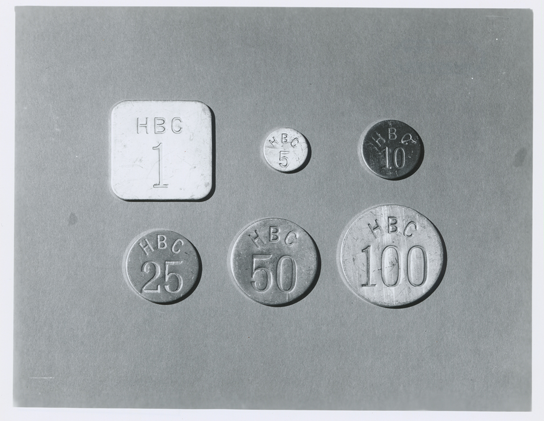 Ces jetons étaient ronds. Ils étaient en aluminium épais et furent émis en cinq valeurs : 5, 10, 25, 50 et 100 cents. Ils mesuraient respectivement : 20 mm, 26 mm, 32 mm, 39 mm et 46 mm. Le sixième jeton, celui qui valait une peau de renard arctique, était carré. Il était frappé du chiffre 1 et mesurait 46 mm. Tous les jetons étaient frappés de leur valeur et des lettres HBC d’un côté. L’autre côté ne portait aucun signe ni aucune inscription.