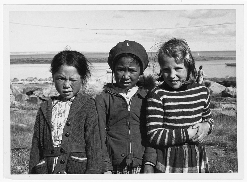 “Little Lily Swaffield and two of her native friends.” [Left and middle: Ayowna Emiktowt and Hattie Alagalak] 1956. Photographer: O.J. Gromme. Names in square brackets provided by Jackie Netser of Coral Harbour.
