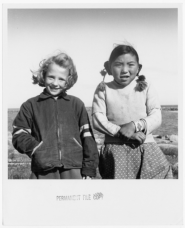 “Eastern Arctic: Southampton Island – Post manager’s daughter and Eskimo girl [Marguerite Nakoolak].” 1953. Photographer: Don Blair. Name in square brackets was provided by Tommy Bruce of Coral Harbour.