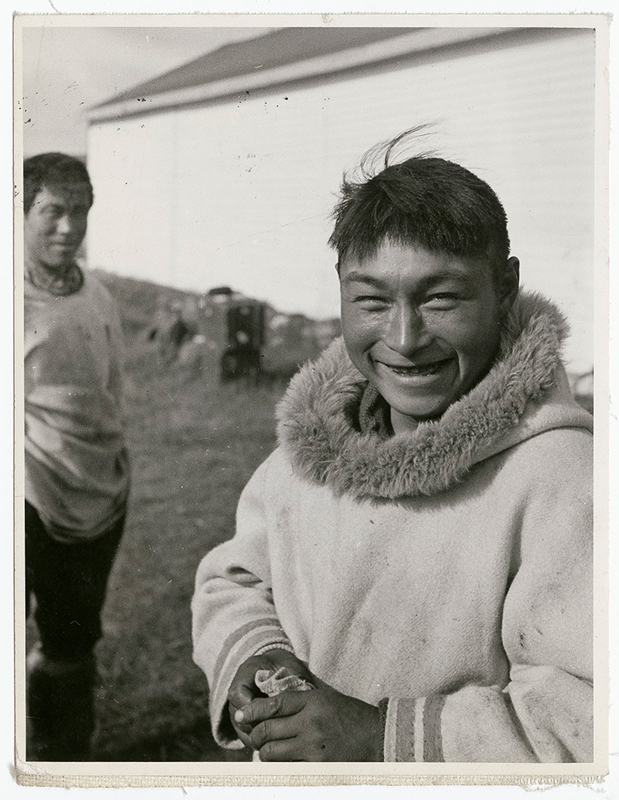 Unidentified Inuit men standing outside post building. Man in foreground is smiling. [193-?]. Photographer: [Harvey Bassett?].