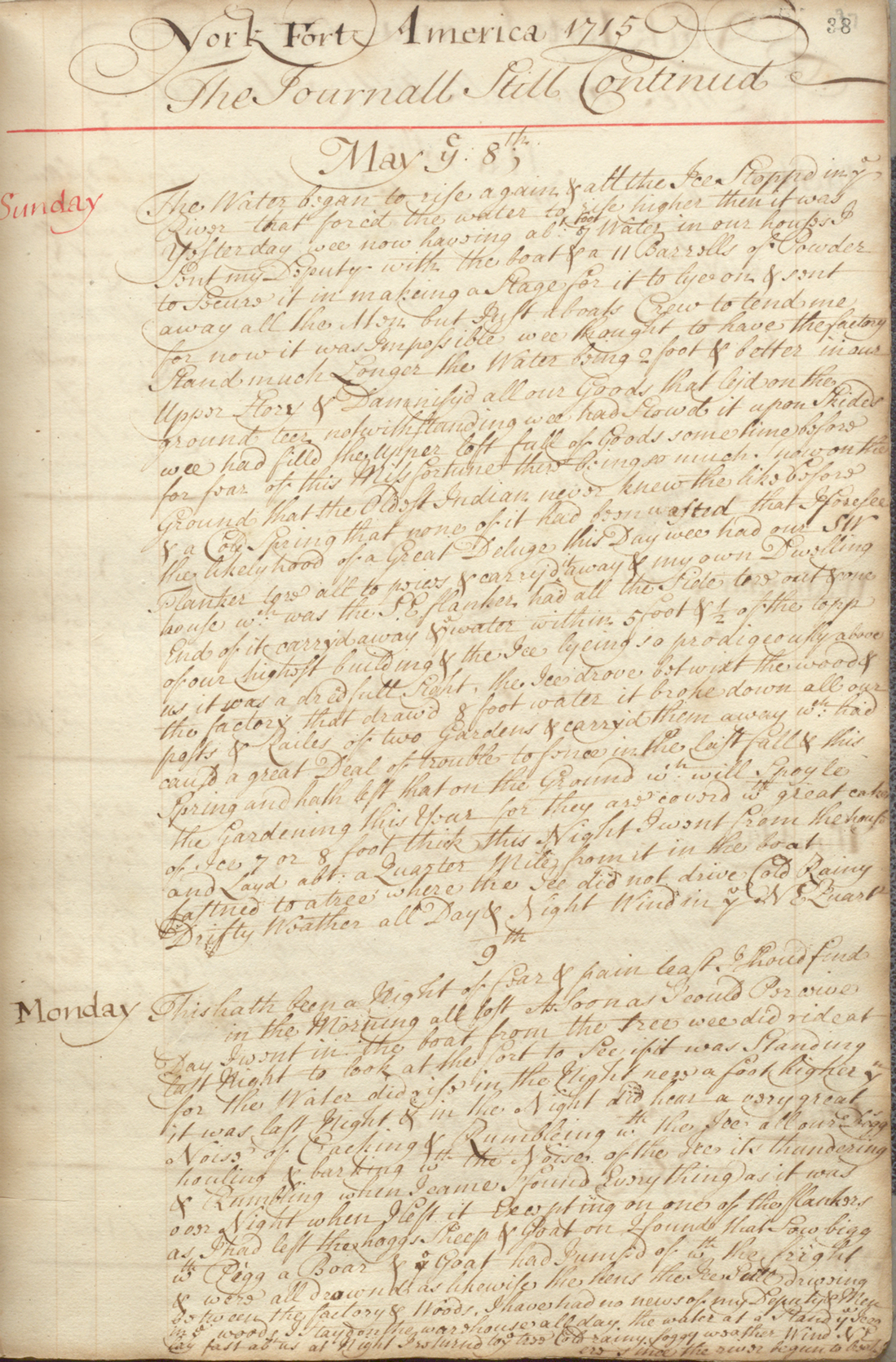 While the overall tone of this journal is factual and professional, there are times when Knight’s personality seems to emerge, like in his 9 May 1715 entry when he is bracing for the worst after a flood had swept away much of the fort: