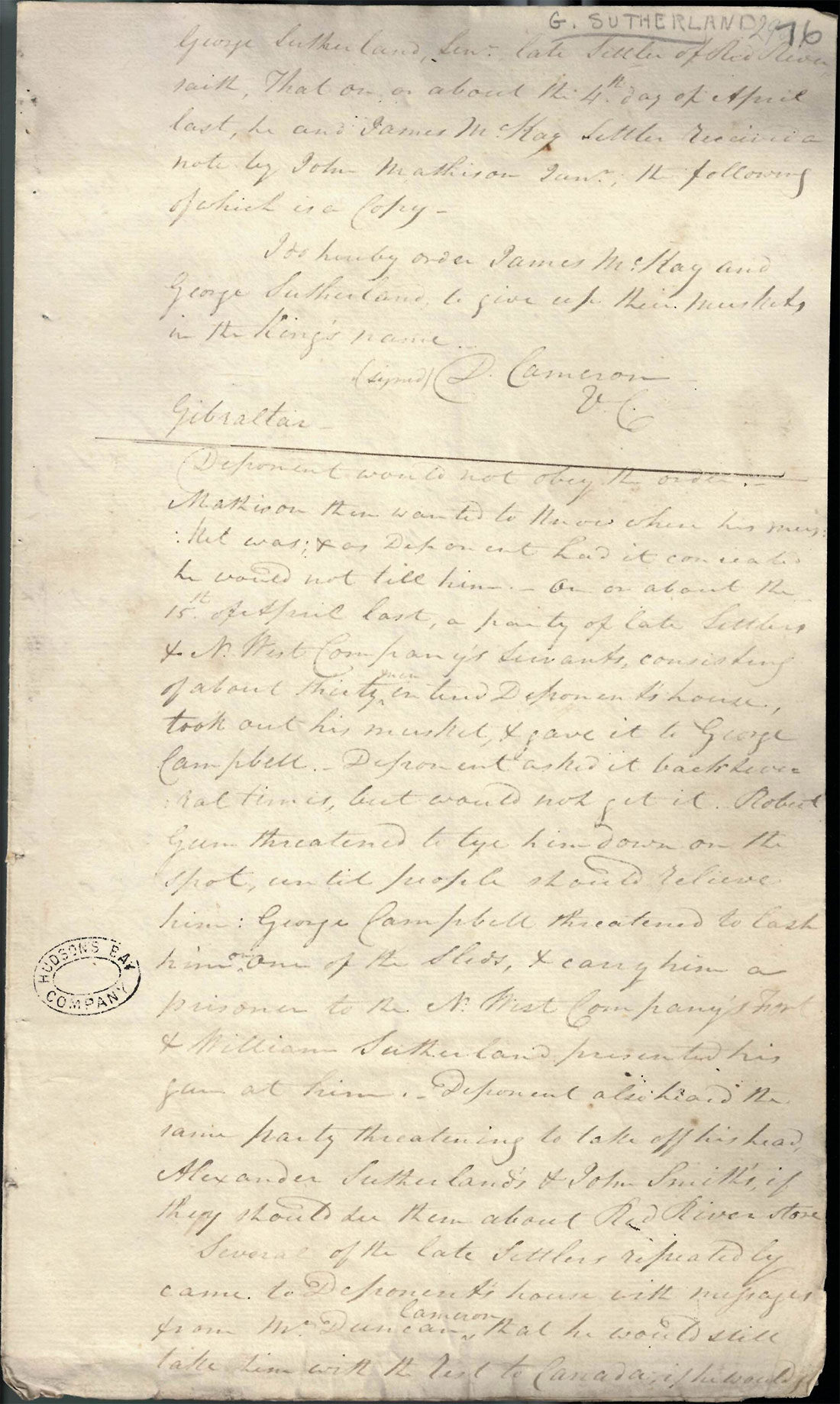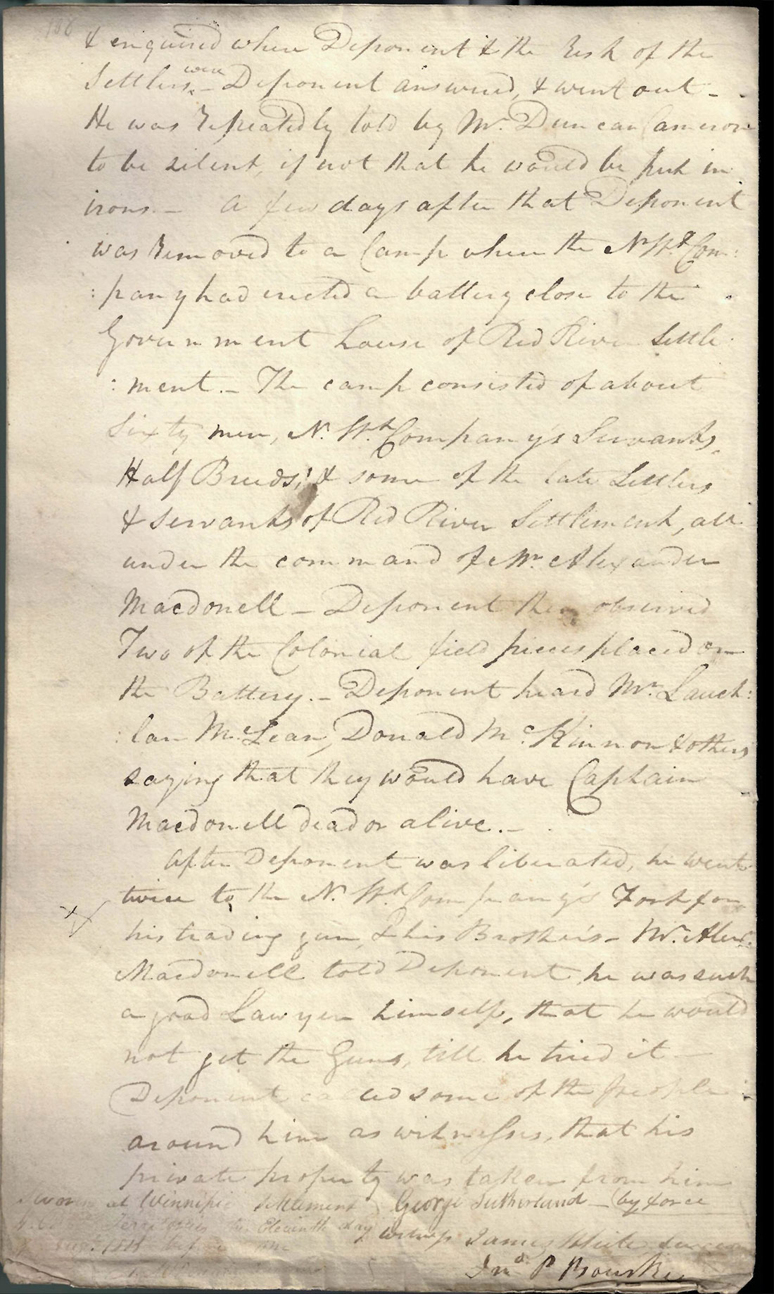 George Sutherland and his family had been Red River settlers at the time of the alleged NWC activities. In his deposition, pictured below, Sutherland recounts the events leading to his eviction, explaining that in early April 1815, he received a note from Captain Duncan Cameron of the “Voyageur Corps” demanding he “give up [his] musket in the King’s name”. Sutherland refused to hand over his gun and as a result, NWC men arrived to seize his musket by force and remove him and his family to a make-shift prison at an encampment on the Frog Plain (present-day neighbourhood of West Kildonan in Winnipeg). The deposition also notes witnesses who affirmed that Sutherland’s “property was taken from him by force.”