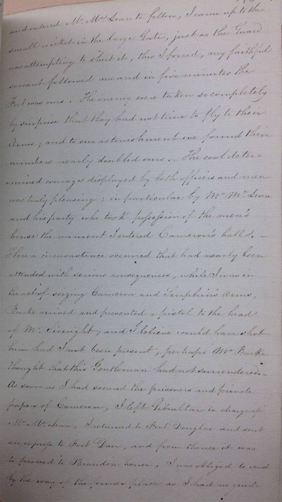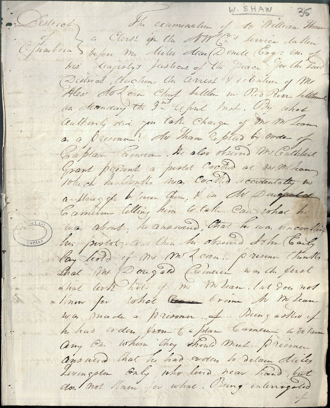When asked by his examiners – “By what authority did you take charge of Mr McLean as a prisoner!” Shaw replied “by order of Captain Cameron”. Shaw goes on to specify the details of the Captain’s orders and the events that followed.