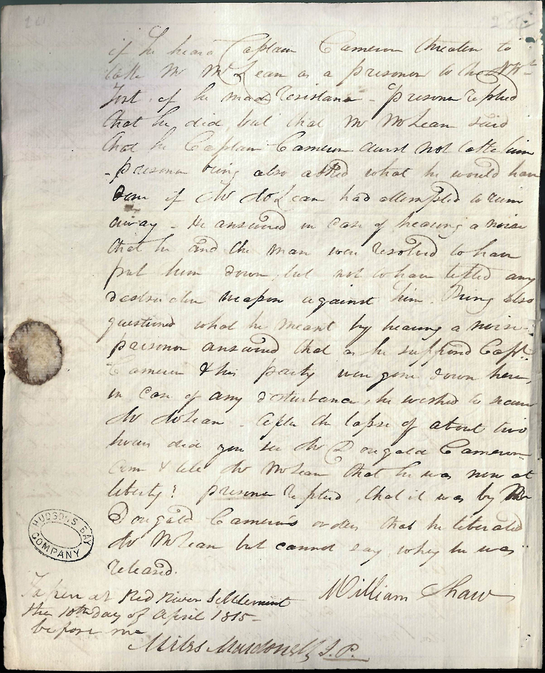 The second deposition is the “examination of Mr William Shaw”, pictured below. Shaw had been employed as a NWC clerk in the Spring of 1815 and had participated in the forced evictions of Red River settlers. In the deposition, Shaw is being questioned for his involvement in the capture and imprisonment of Alexander McLean, the “Chief settler in Red River Settlement”.