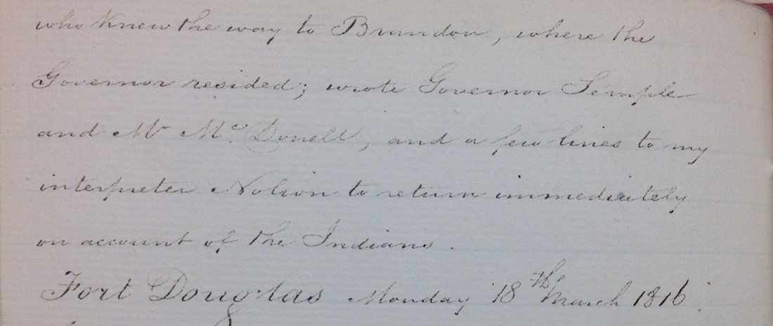After the Pemmican Proclamation in 1814, tensions escalated between the Hudson’s Bay Company (HBC) and the North West Company (NWC). HBC’s Fort Douglas and NWC’s Fort Gibraltar were both on the banks of the Red River, near the Forks. Colin Robertson, who was in charge of Fort Douglas at this time, recorded his thoughts and observations in several personal diaries. By looking at his diaries, one can see the increase in hostility between NWC and HBC, particularly when rumours started to fly.