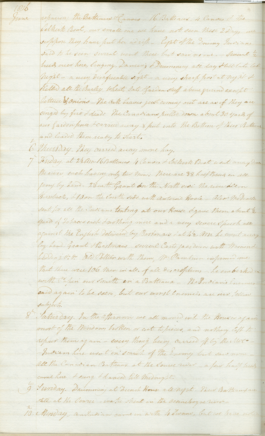 “at ½ past noon about 48 Halfbreeds, Canadians, Freemen & Indians came all riding on Horseback, with their Flag flying blue about 4 feet square & a figure of 8 horizontally in the middle, one beating an Indian Drum, and many of them singing Indian songs. They all rode directly to the usual crossing place of the river where they all stopped about two minutes... They all turned suddenly round and rode full speed into our yard – some of them tyed their Horses, others loose & fixed their flag at our Door, which they soon afterwards hoisted over our East Gate next to the Canadian House. Cuthbert Grant then came up to me in the yard & demanded of me to deliver to him all the keys of our Stores, Warehouses etc. I of course would not deliver them up – They then rushed into the House and broke open the Warehouse Door first, plundered the Warehouse of every article it contained, tore up part of the Cellar floor, & cut out the Parchment windows without saying for what this was done or by whose Authority.”