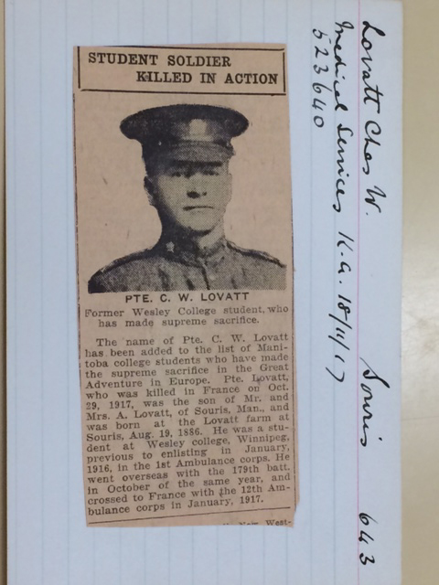 The Archives of Manitoba has created an electronic index of Manitoba soldiers killed in the First World War. This index was generated from a series of index cards created by the Government of Manitoba for the purpose of documenting Manitoba casualties of the First World War. The original index was made during and after the war but was not a complete record. As a result, this electronic index is also not a complete list of Manitobans killed in the First World War. (It would appear that many of the names on the cards were gathered from newspaper casualty lists. Death dates are often the same as those in the newspapers, including the same errors. Some of the men identified as killed were not – and likely reflect errors in the newspaper lists.)
