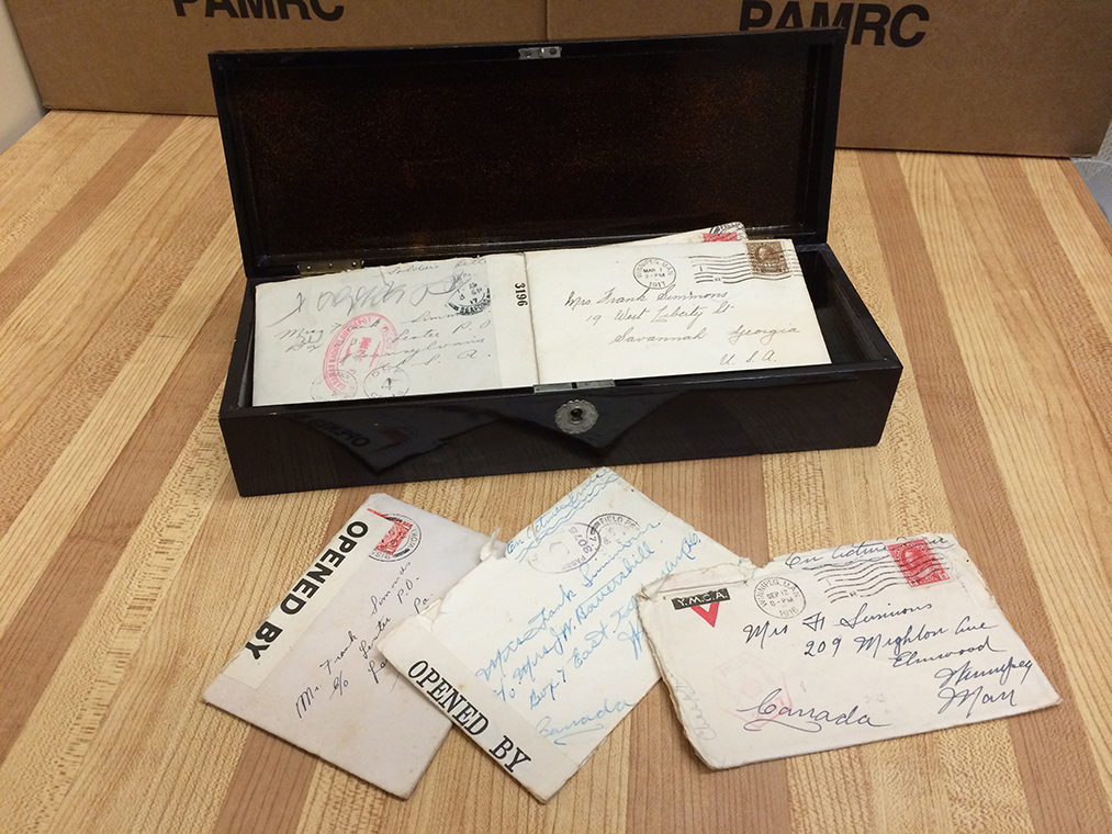 Cet été, nous avons eu la surprise de voir un membre de la famille Battershill communiquer avec nous pour faire don d’une collection de lettres écrites durant la Première Guerre mondiale. Ces lettres sont un excellent ajout à la collection de documents de la famille Battershill déjà détenus aux Archives du Manitoba (voir notre article du 20 mai 2014). Le don comprend des lettres reçues ou envoyées par Amelia Simmons, la sœur de George et Charles Battershill. D’autres lettres ont été écrites par les deux frères ou par d’autres membres de la famille. Plusieurs lettres ont été écrites après la mort de George sur la crête de Vimy.