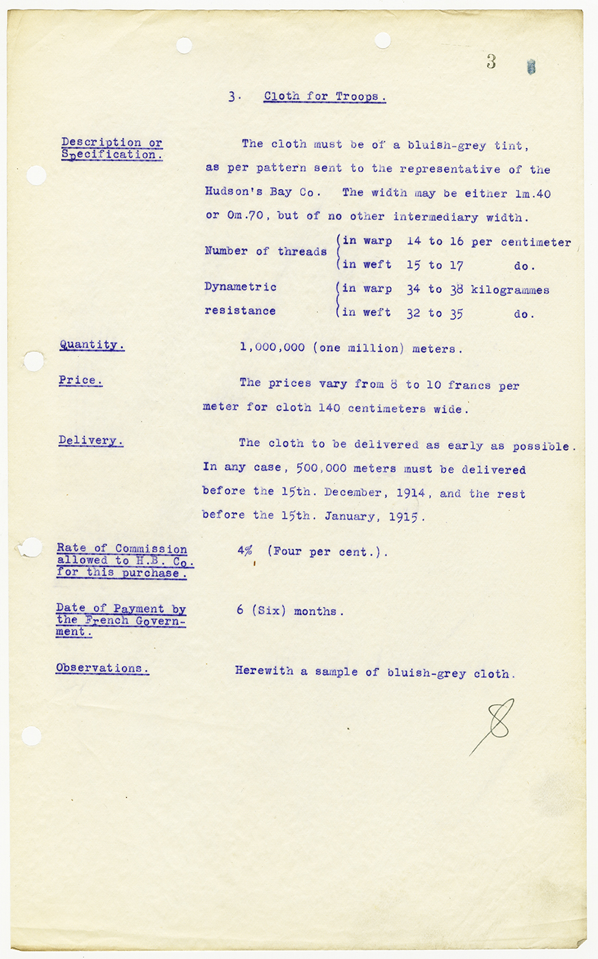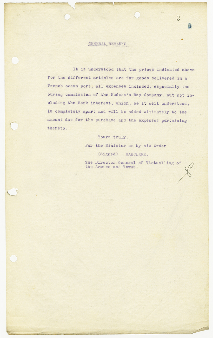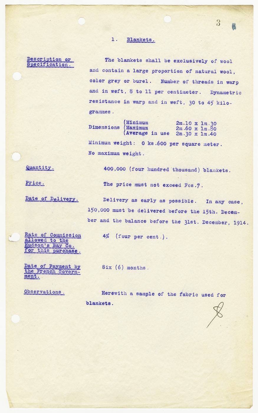 Le 20 octobre 1914, la Compagnie de la Baie d’Hudson reçoit sa première commande envoyée par le directeur général de l’approvisionnement des armées et des villes, au nom du ministère français de la Guerre. De telles commandes découlent de l’entente signée entre la Compagnie et le gouvernement français durant les premiers mois de la Première Guerre mondiale.