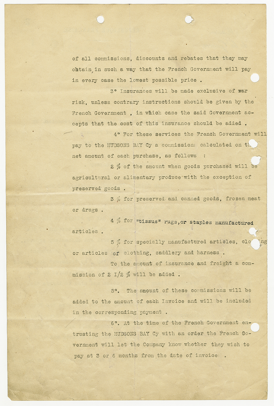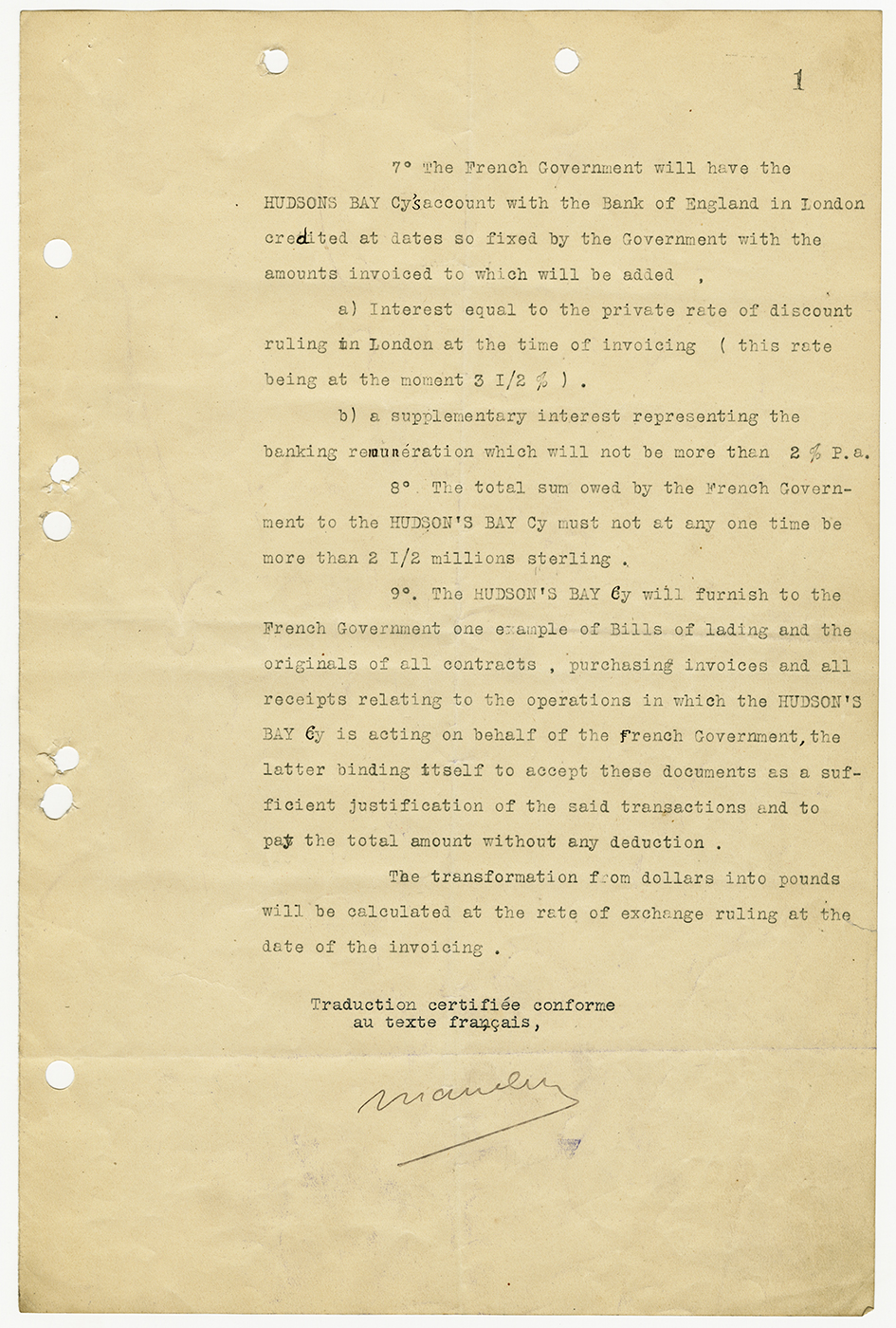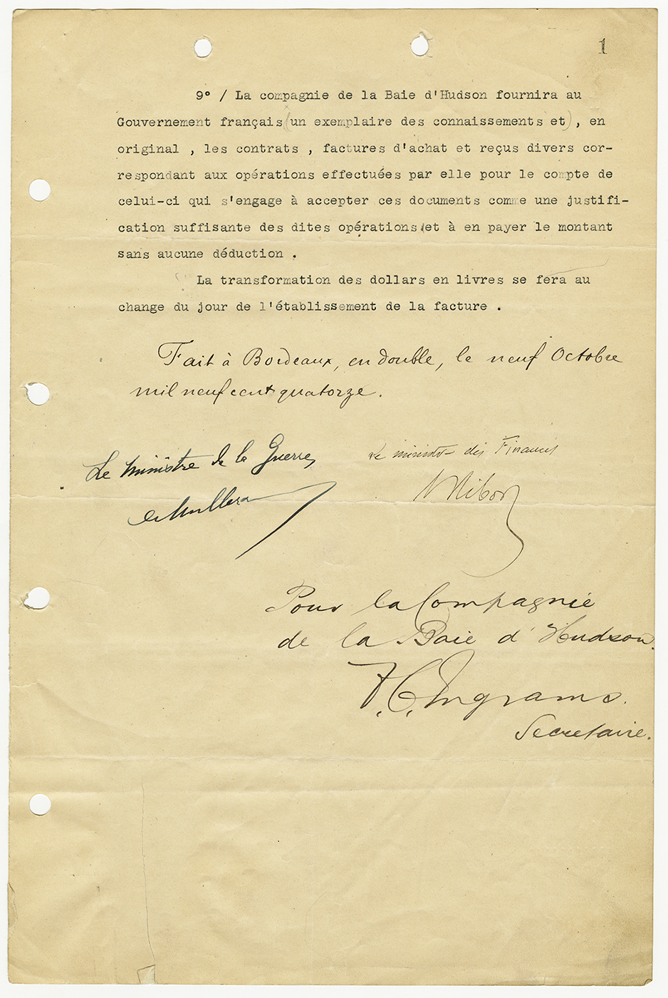Ce qui suit est une entente datée du 9 octobre 1914 et signée par la Compagnie de la Baie d’Hudson et le gouvernement français. Dans cette entente, rédigée en français et en anglais, la Compagnie est nommée commissionnaire d’achat de denrées, de matières premières et d’articles manufacturés pour le compte du gouvernement français. Elle est aussi chargée d’organiser le transport de biens et de produits dans des ports français désignés. Des ententes semblables seront signées par la suite avec les gouvernements belge, russe et roumain. Pendant la durée de la guerre, la Compagnie de la Baie d’Hudson organisera une flotte marchande de plusieurs centaines de bateaux qui transporteront plus de 13 millions de tonnes de biens ainsi que des soldats, des réfugiés et des prisonniers de guerre évadés.
