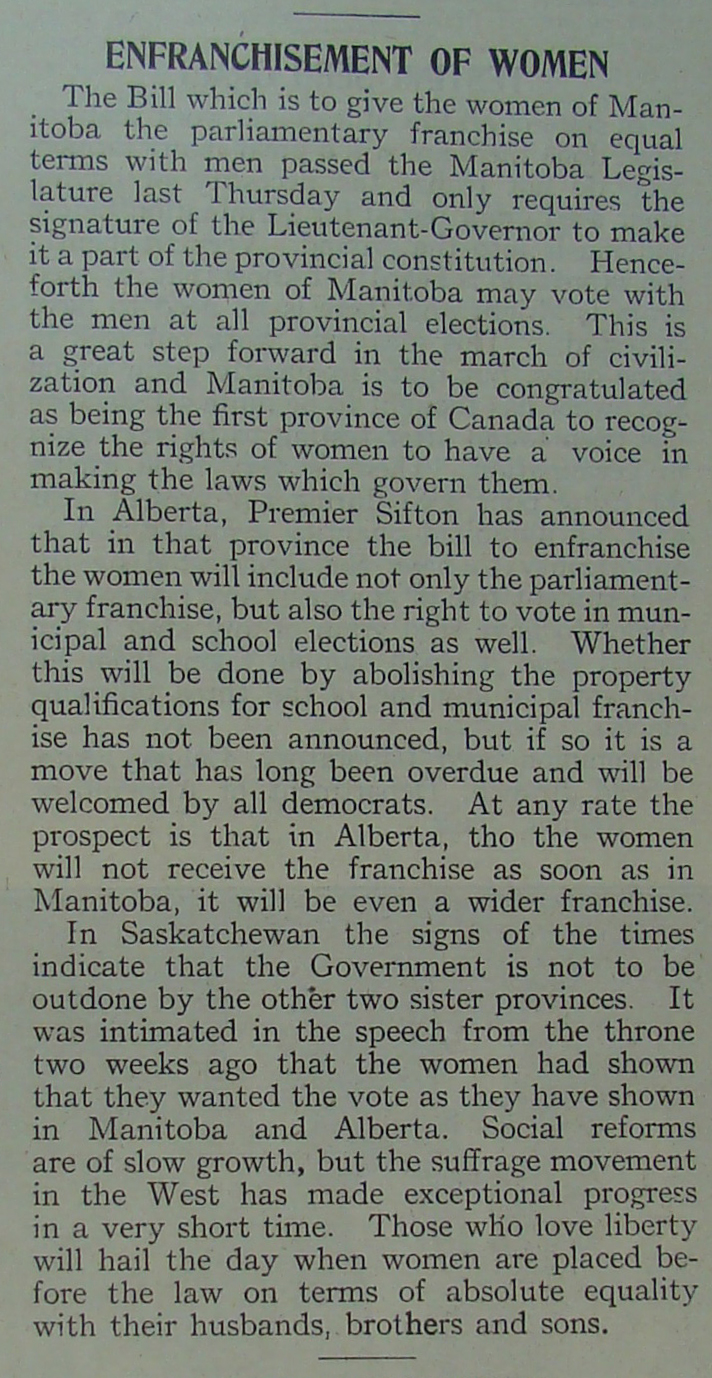 Le 28 janvier 1916, le lieutenant-gouverneur a signé un projet de loi faisant du Manitoba la première province au Canada à accorder le droit de vote aux femmes. Les journaux de la province ont ensuite annoncé la nouvelle aux Manitobains et Manitobaines.