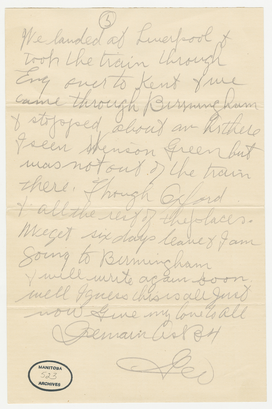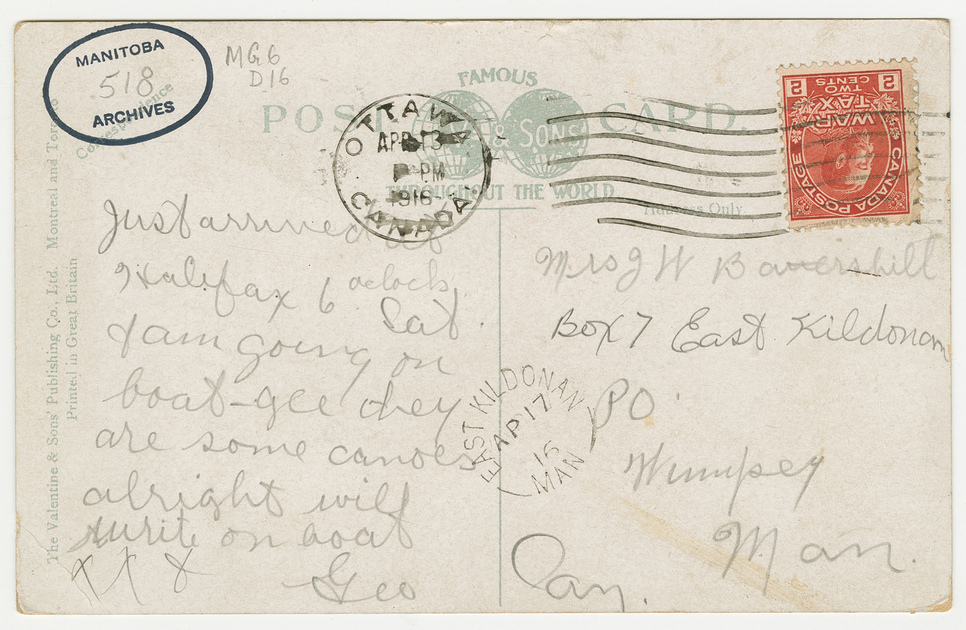 La correspondance de cette semaine comprend deux lettres et une carte postale envoyées à la maison pendant que George voyageait au Canada, en chemin vers un navire qui l’amènerait en Europe. George a quitté Winnipeg par train, probablement en mars 1916, puis est parti d’Halifax sur le SS Olympic (navire frère du SS Titanic) le 1er avril 1916.