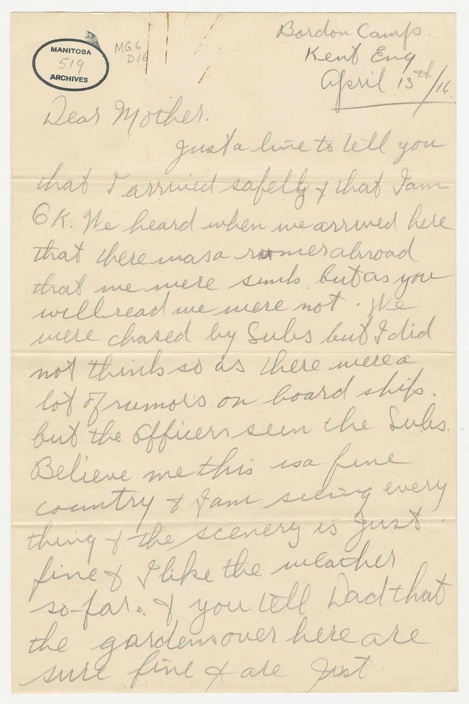 D’avril 2016 à avril 2017, ce blogue présentera les lettres rédigées pendant la Première Guerre mondiale par un soldat du Manitoba, George Battershill, d’East Kildonan. La plupart des lettres étaient destinées à sa mère ou à son père.