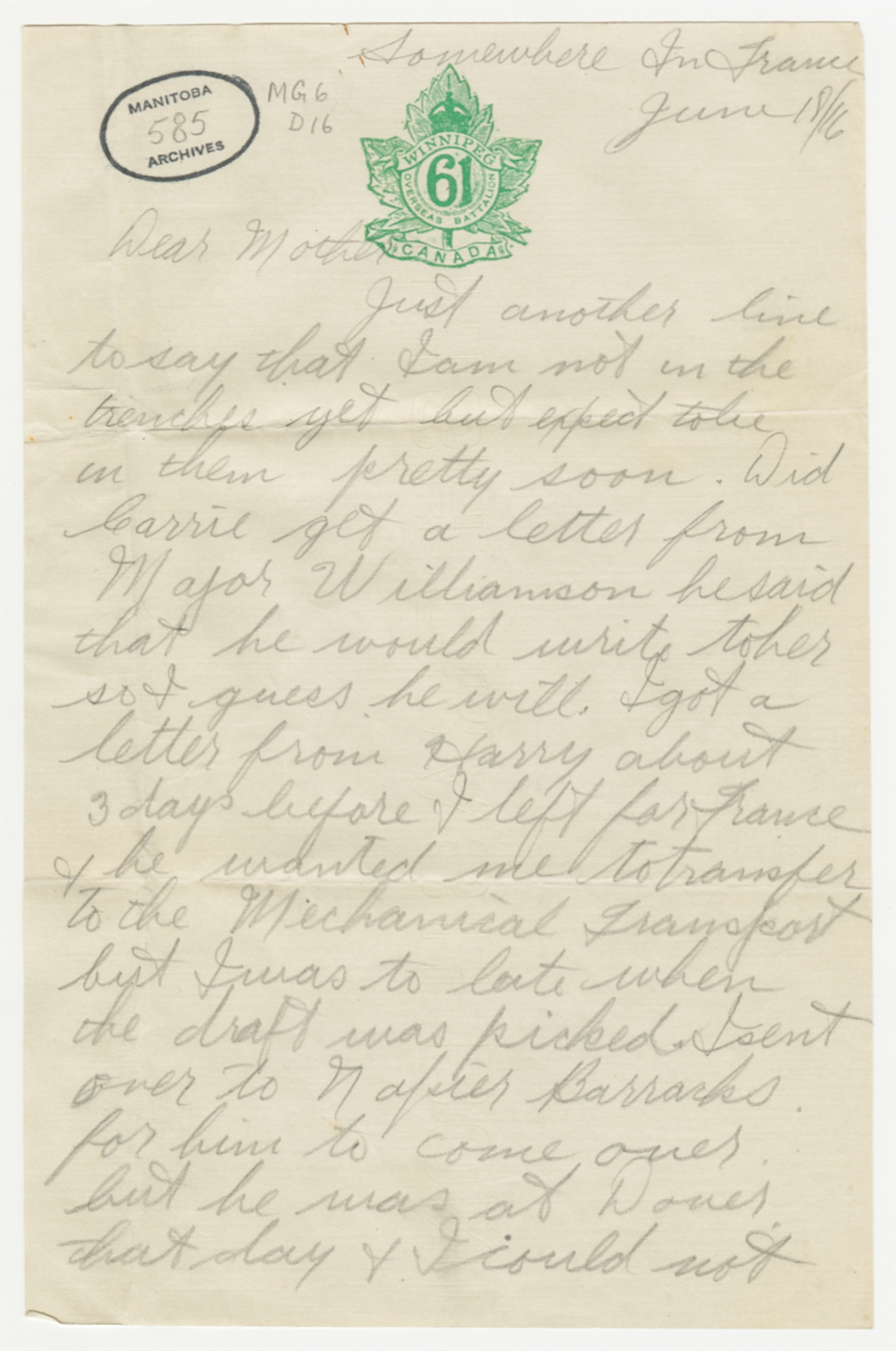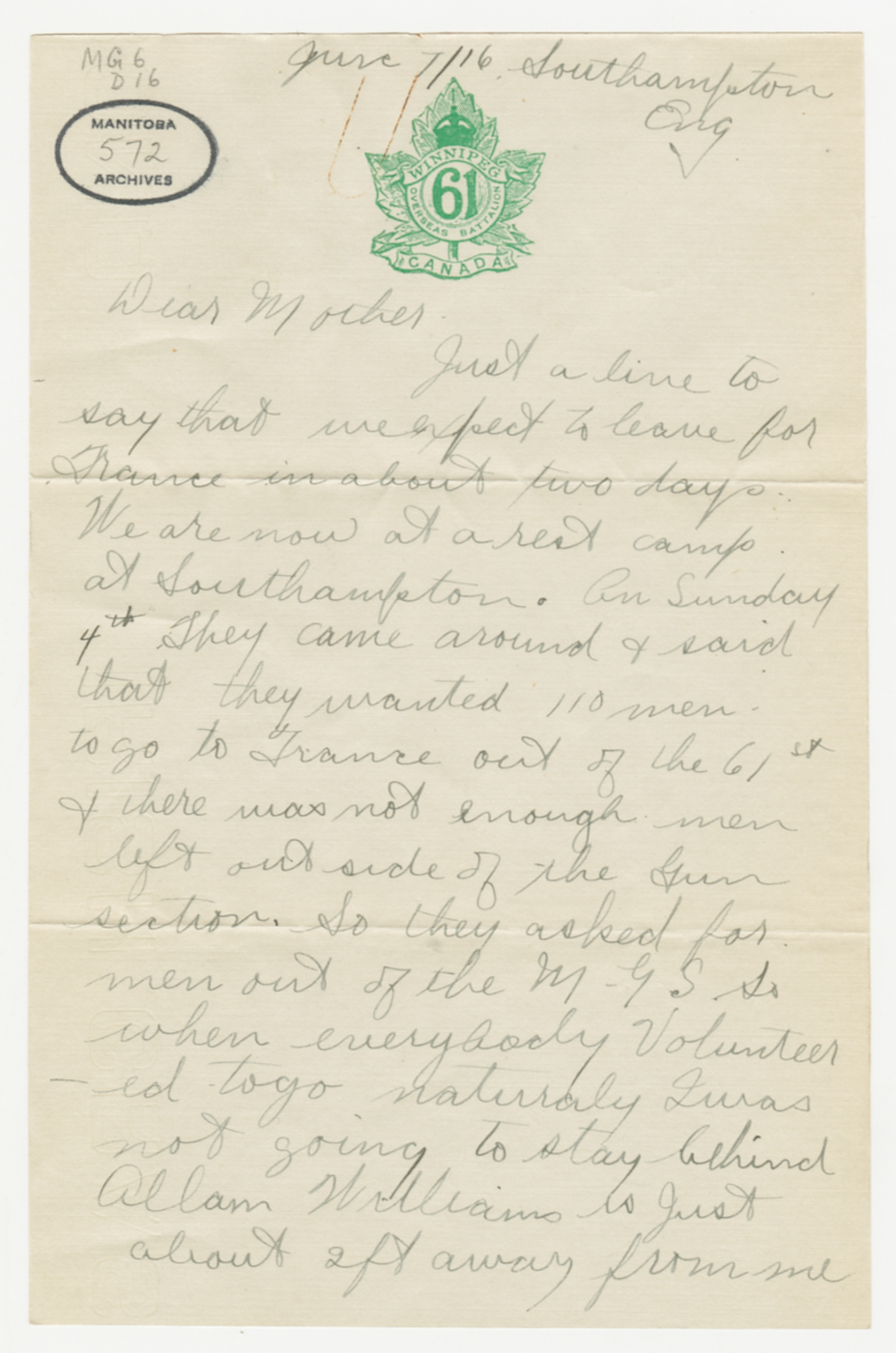 Il y a cent ans cette semaine, George Battershill débarquait en France. Sa lettre du 7 juin a été écrite de Southampton, en Angleterre, tandis que les deux lettres suivantes présentées cette semaine ont été écrites « Somewhere in France » (quelque part en France). Ainsi commence une longue série de lettres écrites « quelque part » en France ou en Belgique.