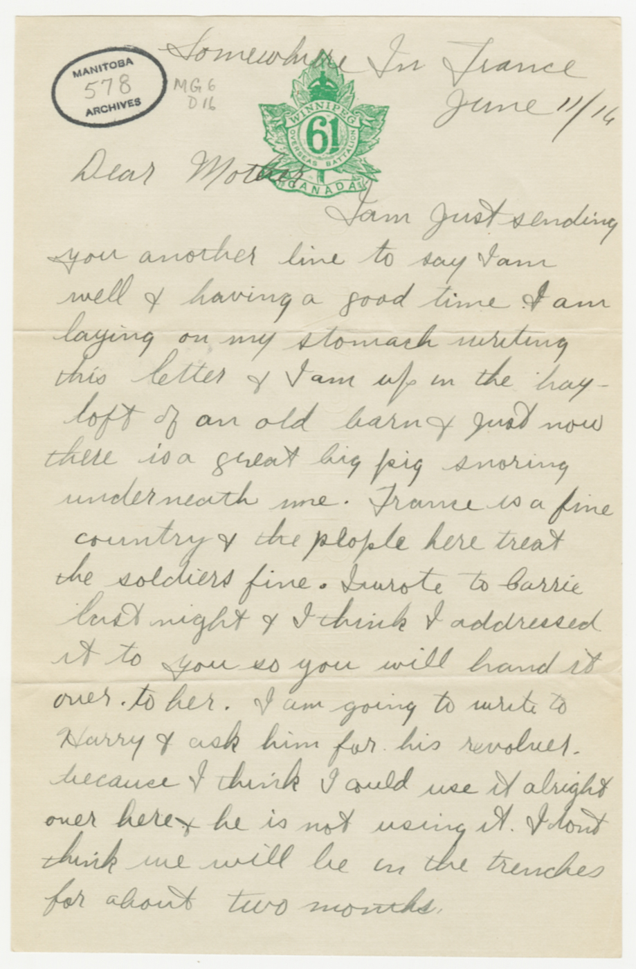 « I am laying on my stomach writing this letter and I am up in the hayloft of an old barn + just now there is a great big pig snoring underneath me. France is a fine country and the people here treat the soldiers fine. »