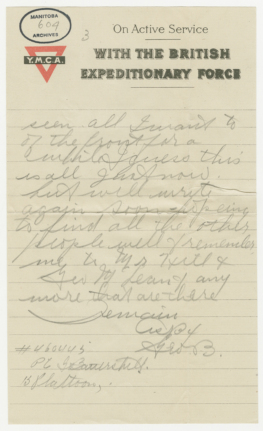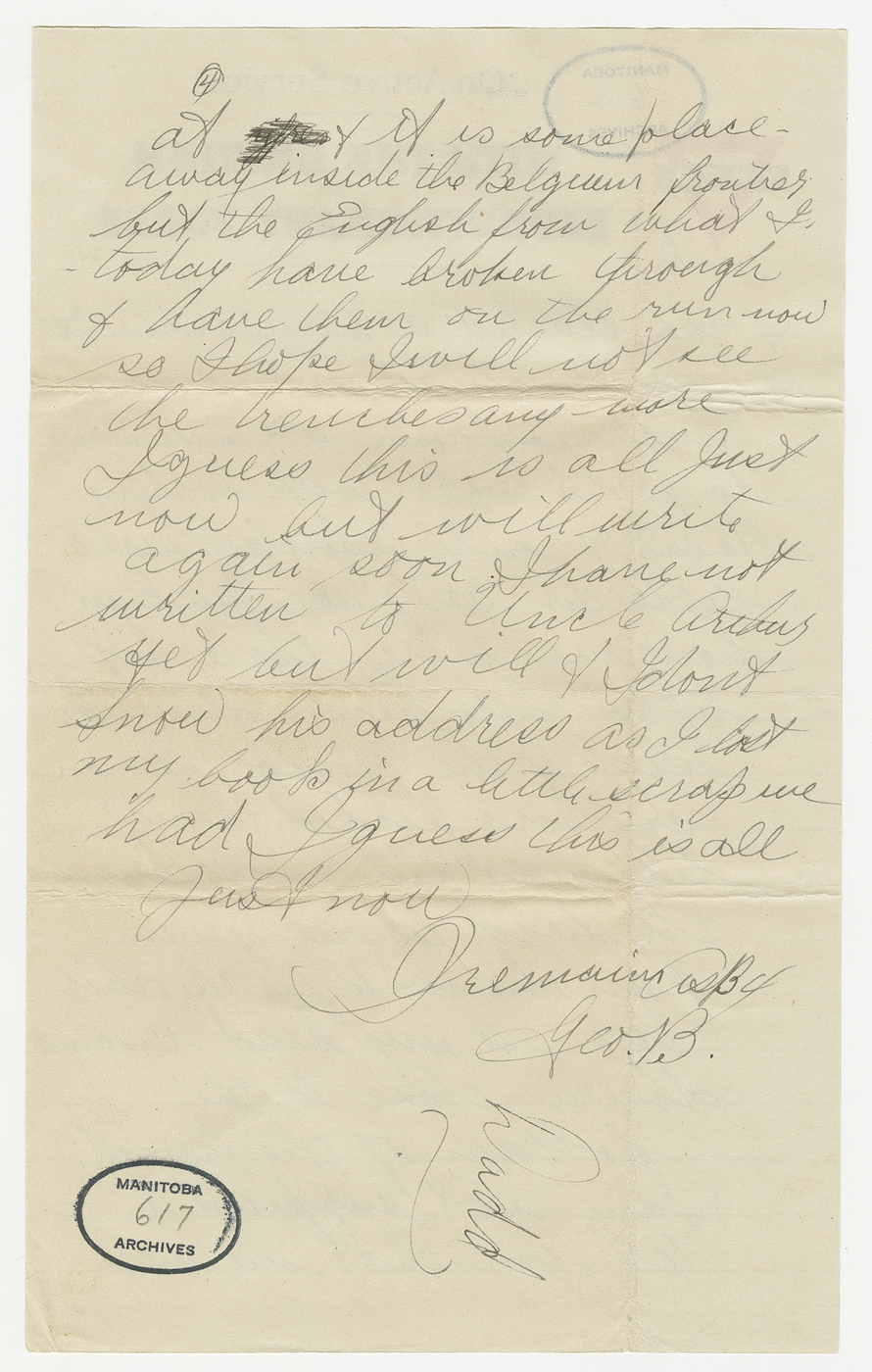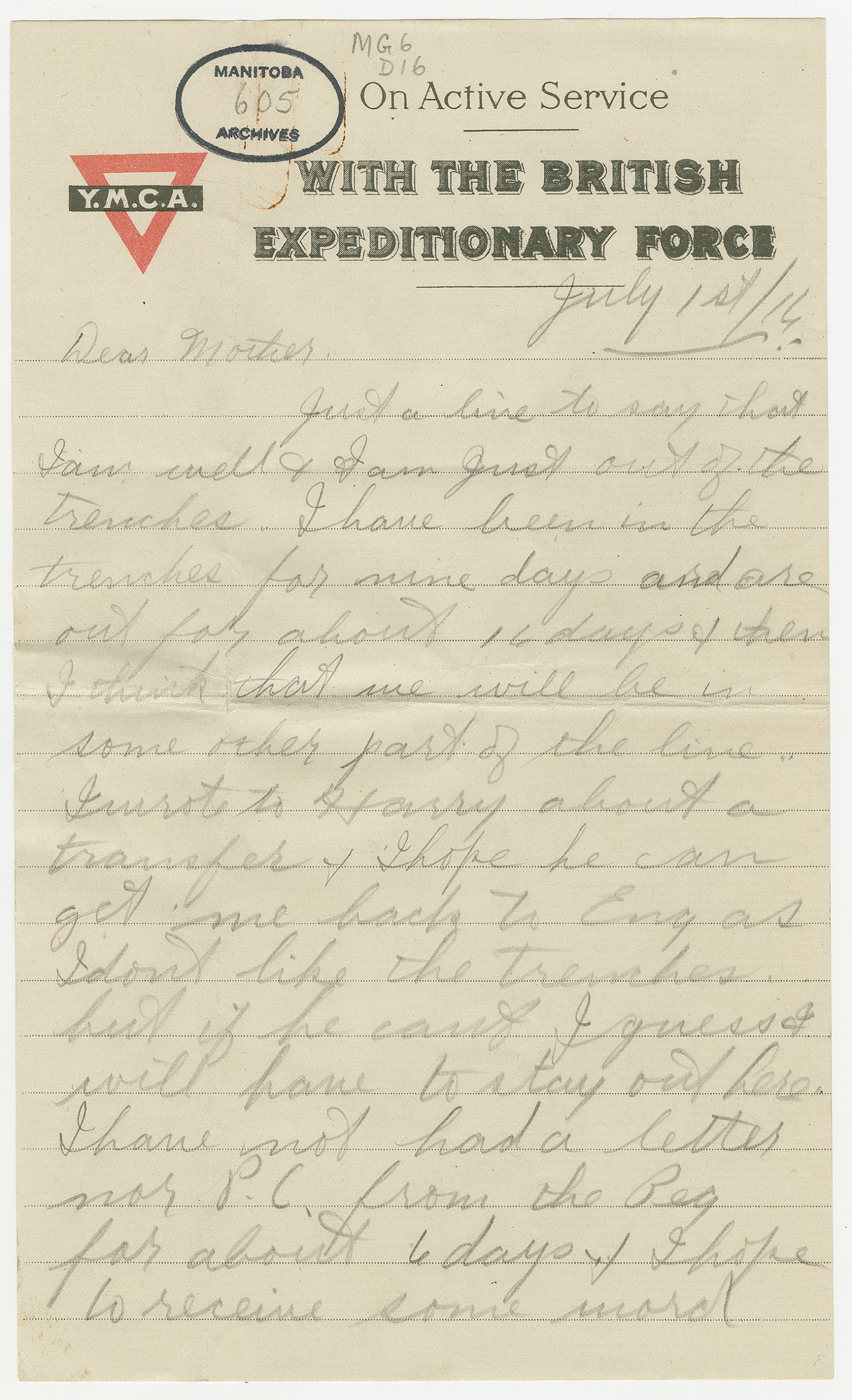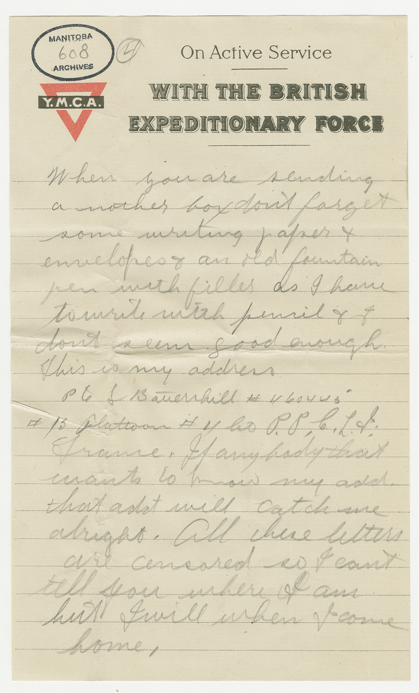 D’avril 2016 à avril 2017, ce blogue présentera les lettres rédigées pendant la Première Guerre mondiale par un soldat du Manitoba, George Battershill, d’East Kildonan. La plupart des lettres étaient destinées à sa mère ou à son père. Le blogue suivra la correspondance rédigée par George la même semaine, il y a 100 ans.