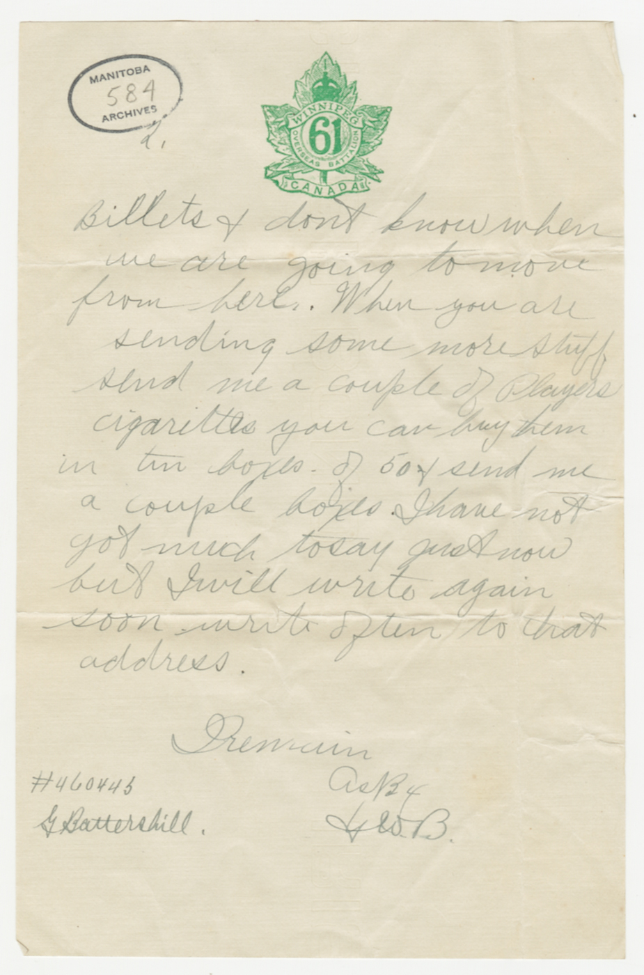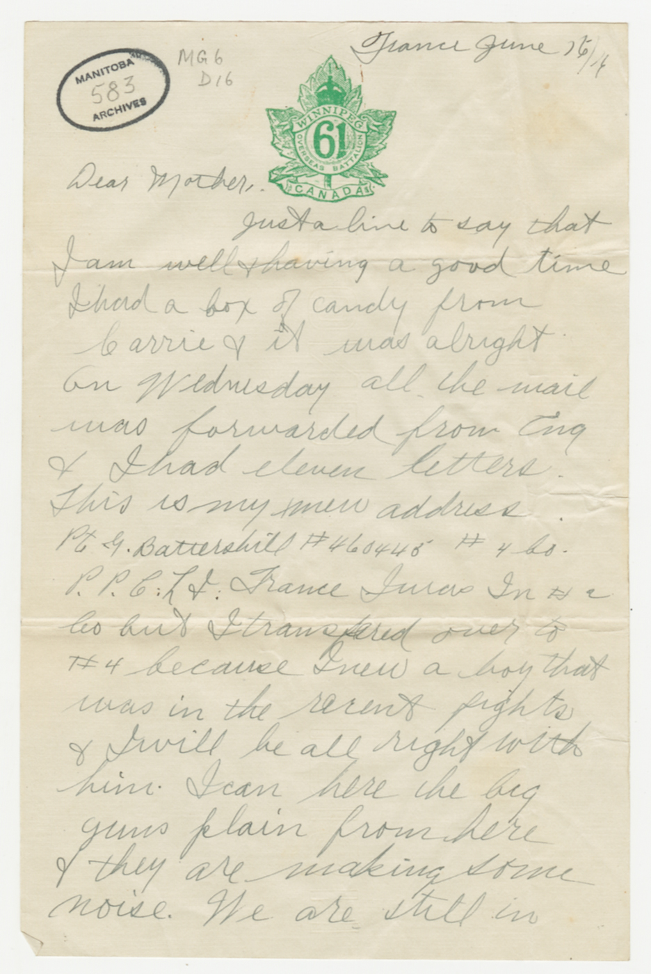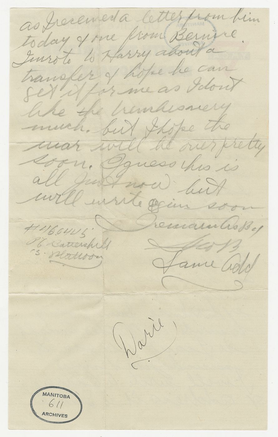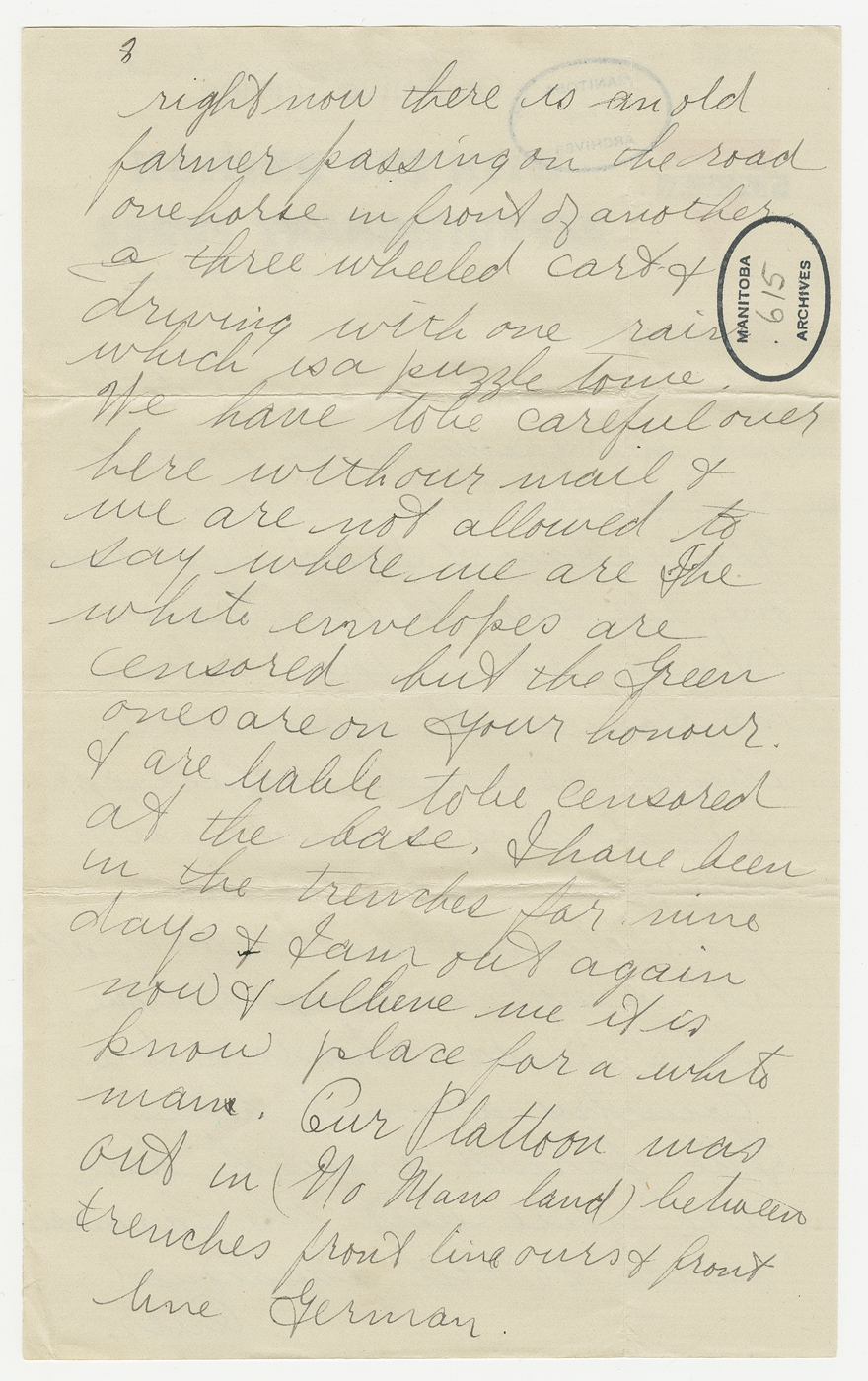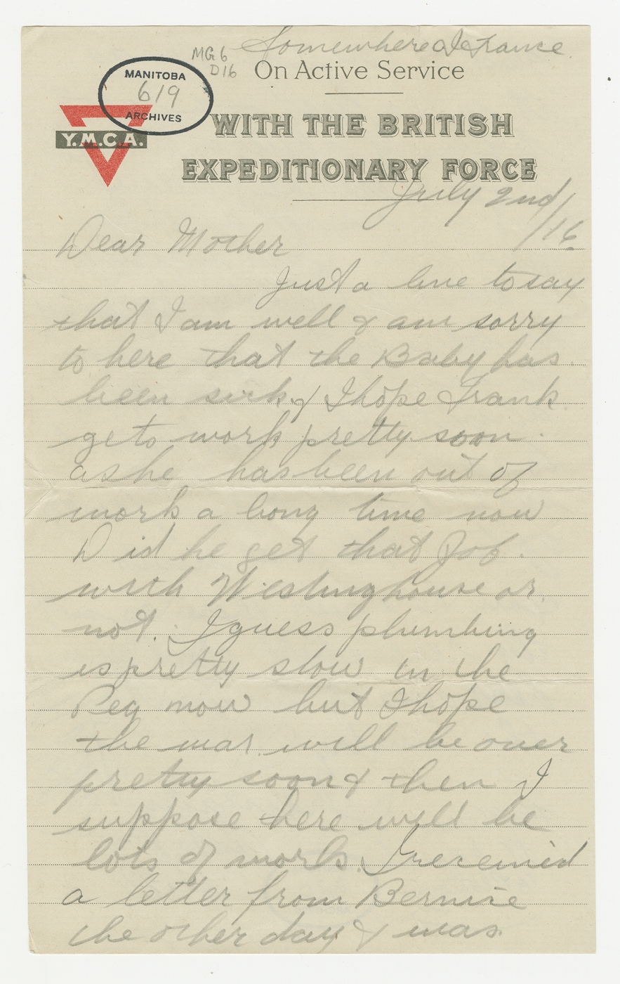 D’avril 2016 à avril 2017, ce blogue présentera les lettres rédigées pendant la Première Guerre mondiale par un soldat du Manitoba, George Battershill, d’East Kildonan. La plupart des lettres étaient destinées à sa mère ou à son père. Le blogue suivra la correspondance rédigée par George la même semaine, il y a 100 ans.