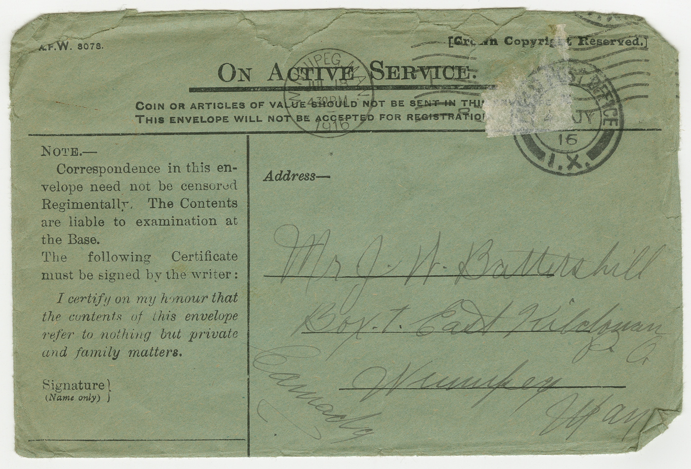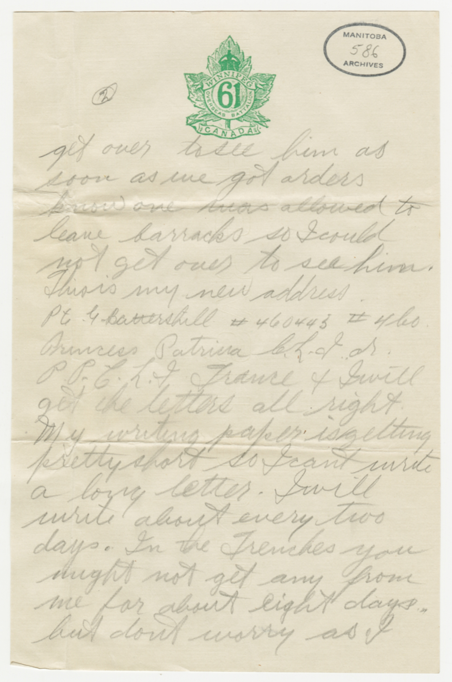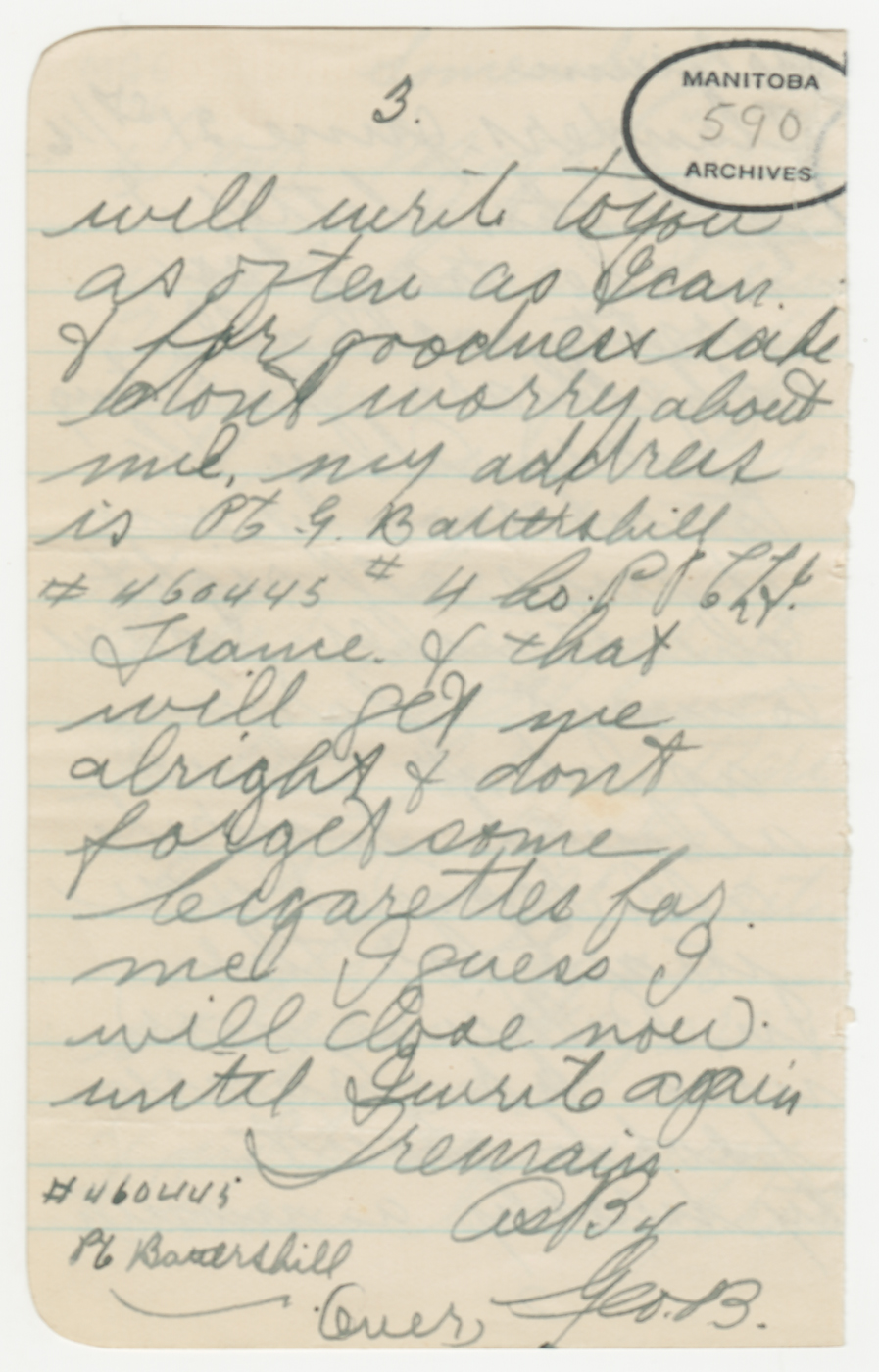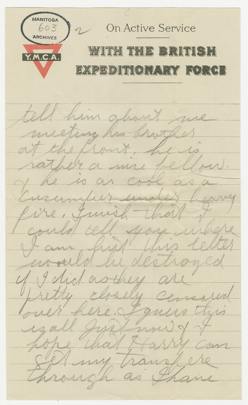D’avril 2016 à avril 2017, ce blogue présentera les lettres rédigées pendant la Première Guerre mondiale par un soldat du Manitoba, George Battershill, d’East Kildonan. La plupart des lettres étaient destinées à sa mère ou à son père. Le blogue suivra la correspondance rédigée par George la même semaine, il y a 100 ans.