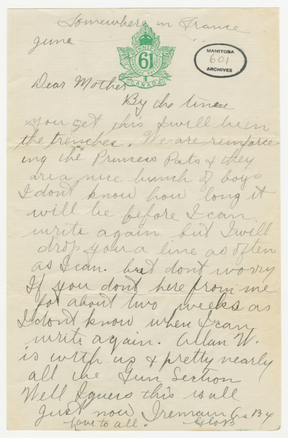 - Le 6 juin : Un soldat du Manitoba : Quelque part en France