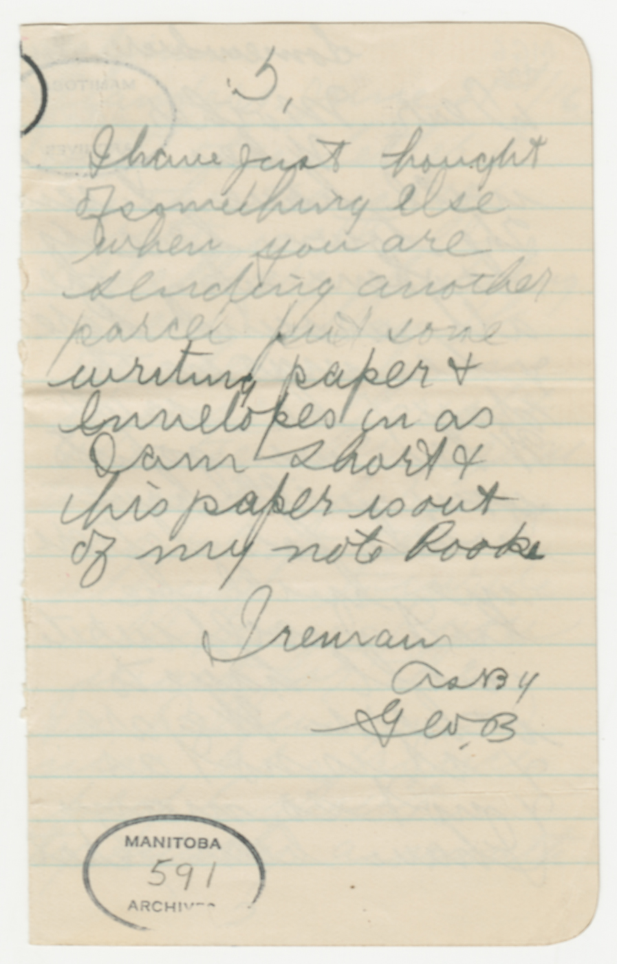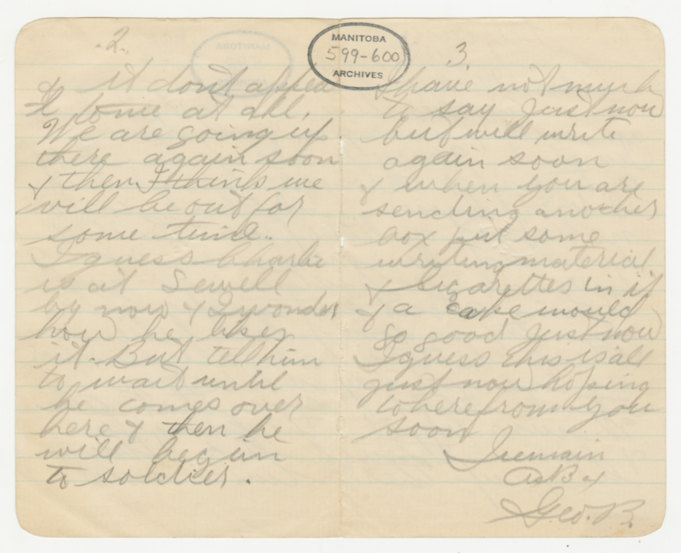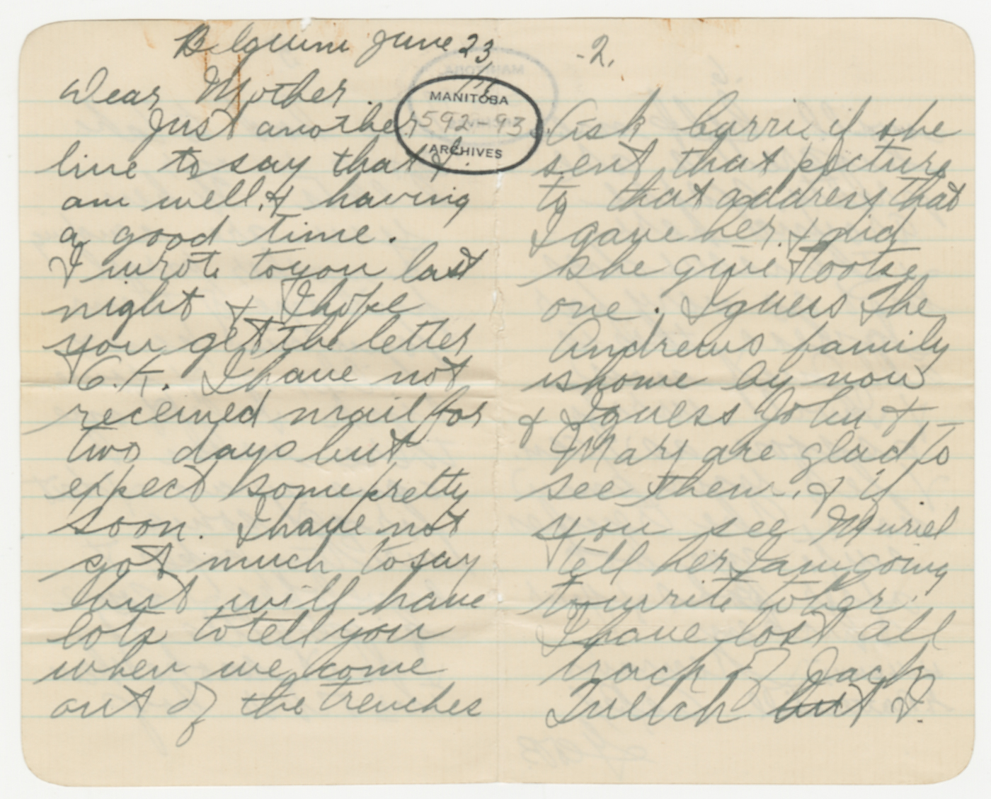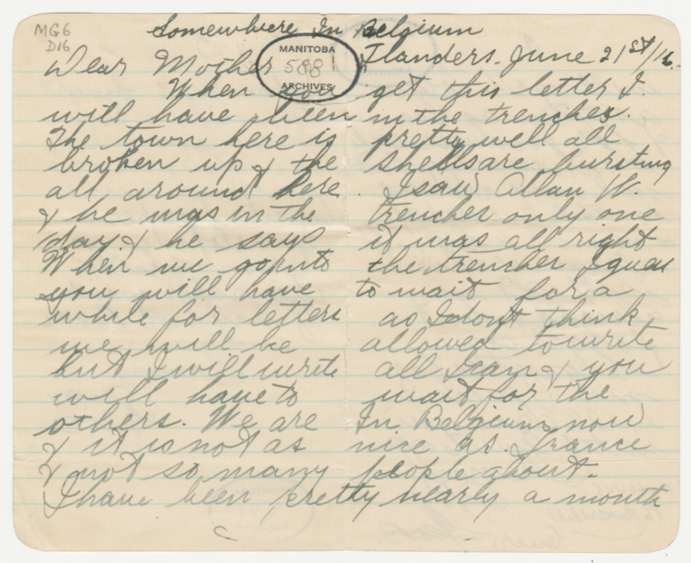 Dans sa lettre du 26 juin, George parle à sa mère des tranchées : « I have been up there twice now + it don’t appeal to me at all ». Il lui demande de lui envoyer du papier (et des cigarettes), car il ne lui reste plus de papier à lettres et il écrit sur des feuilles arrachées de son carnet de notes.