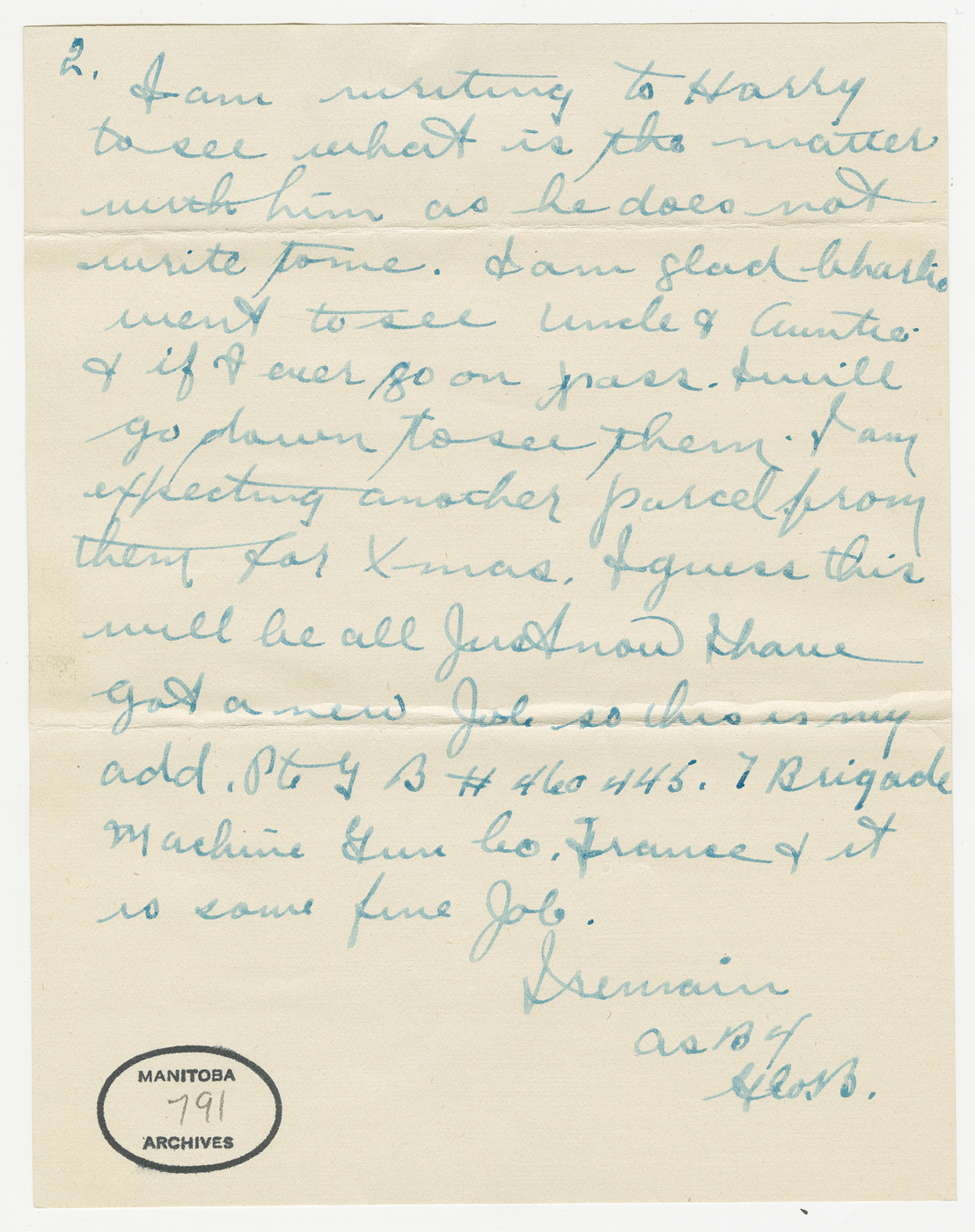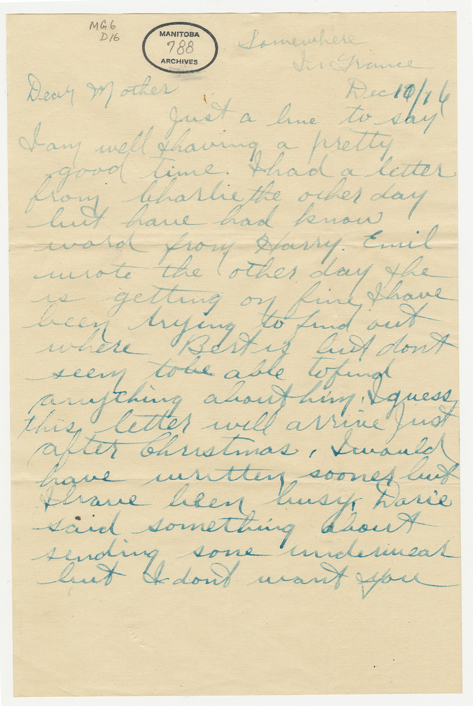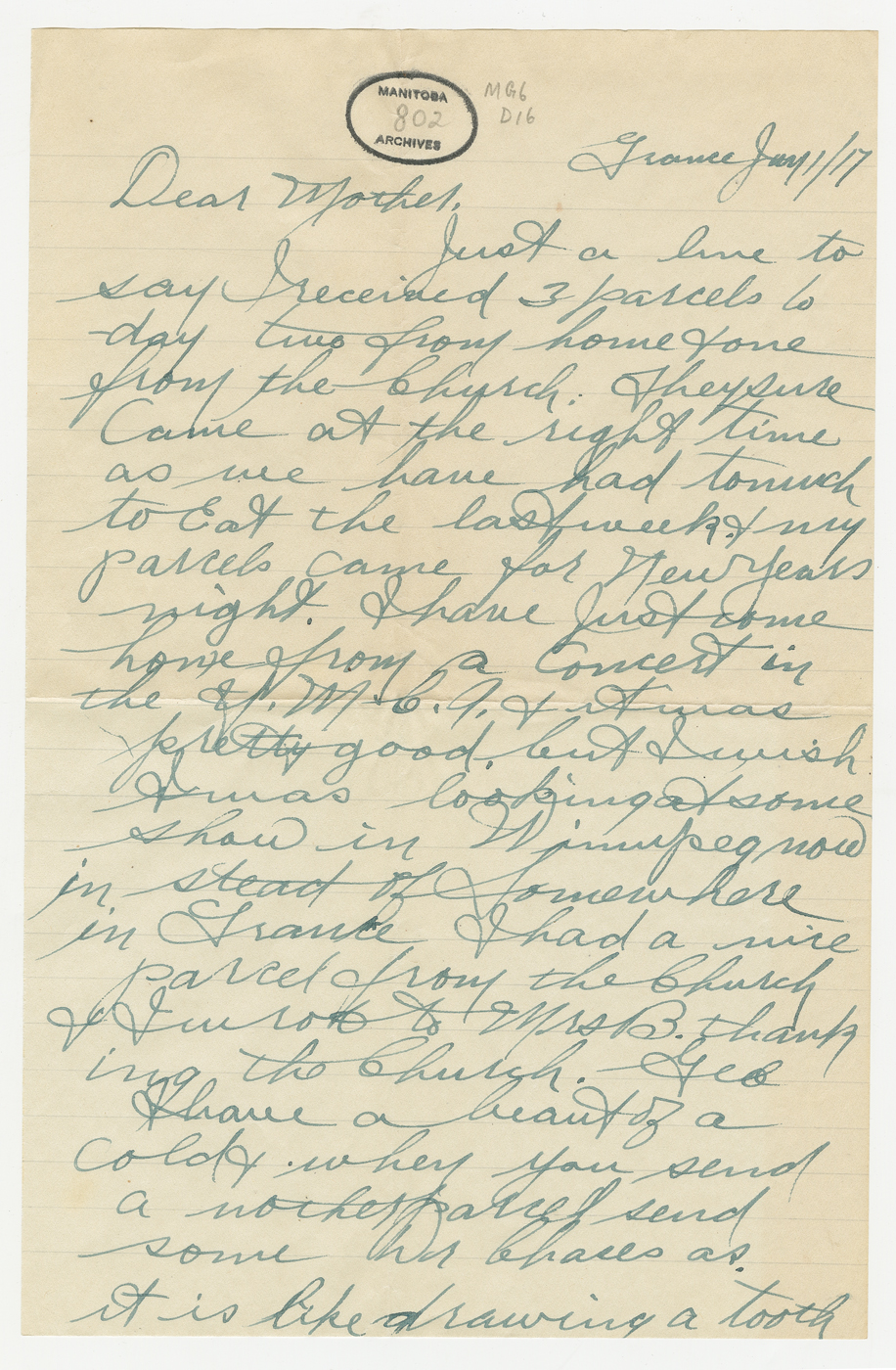 « Just a line to say I received 3 parcels today, two from home + one from the Church. They sure came at the right time as we have had too much to eat the last week + my parcels came for New Years night. I have just come home from a concert in the Y.M.C.A. + it was pretty good but I wish I was looking at some show in Winnipeg now instead of Somewhere in France. I had a nice parcel from the Church 6 wrote to Mrs. B. thanking the Church. »