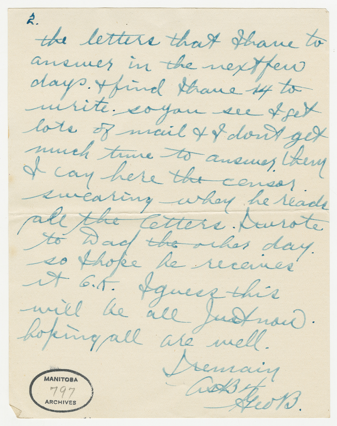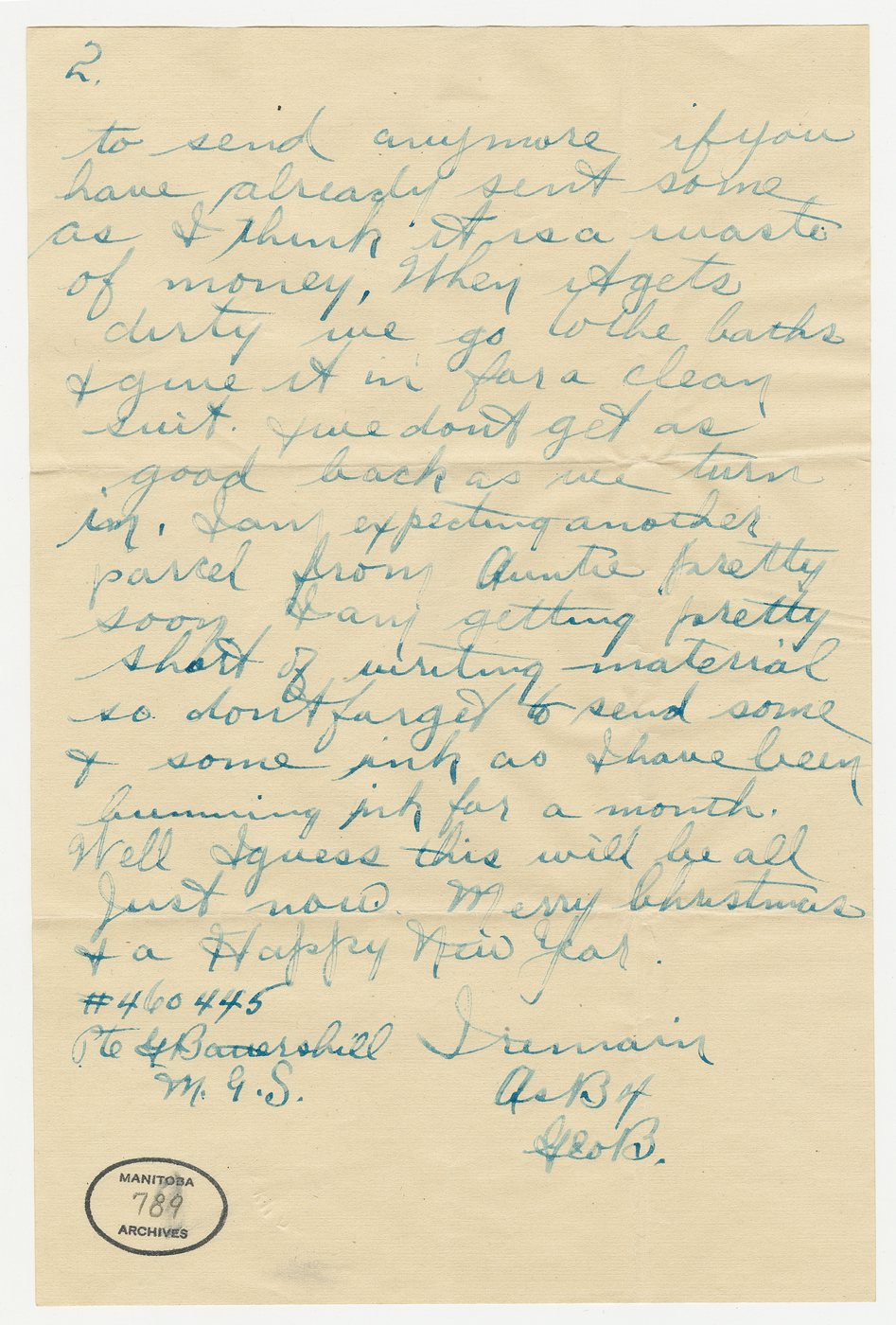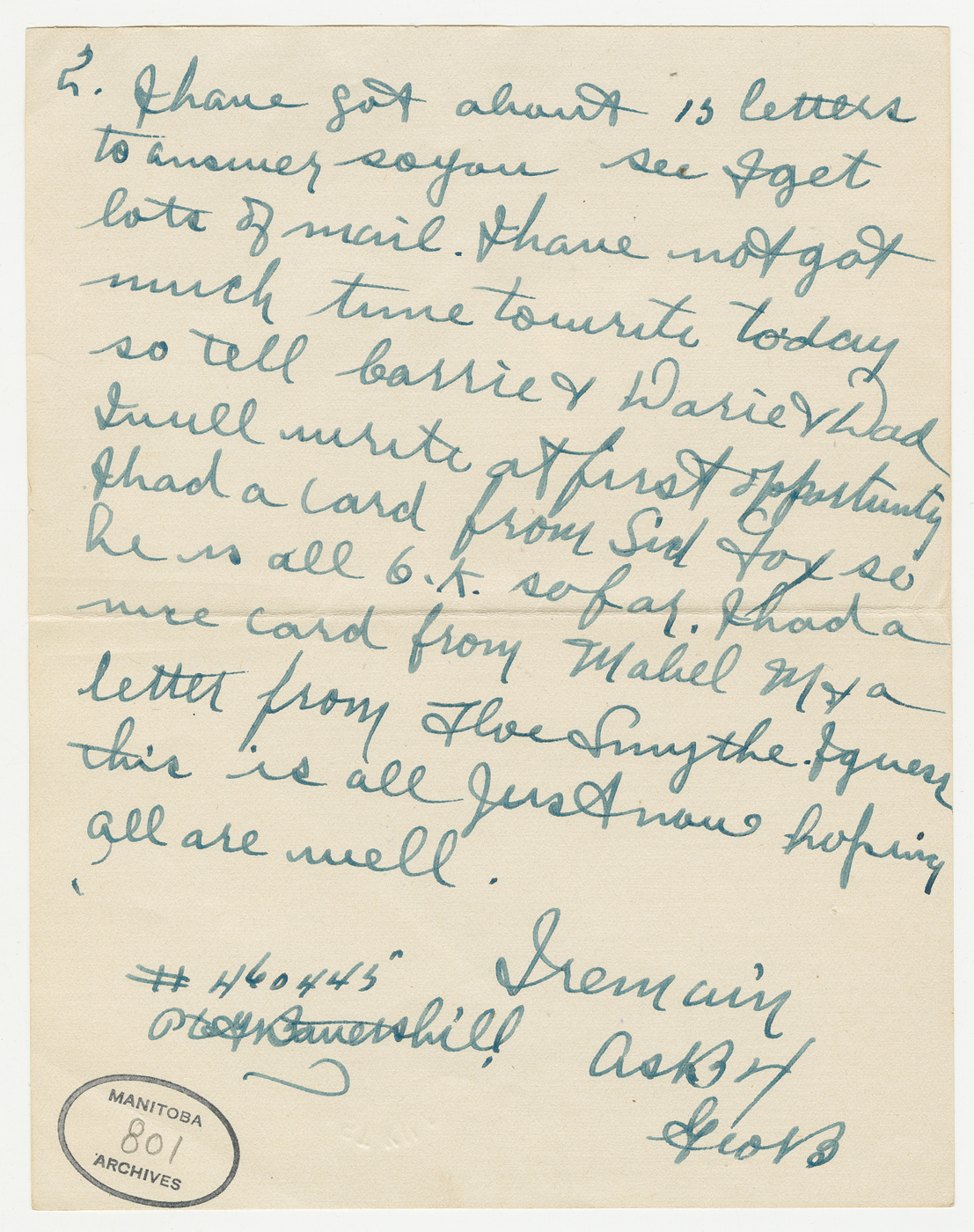 Cette semaine, les lettres de George Battershill comprennent une lettre à chacun de ses parents et une autre à sa sœur, Dorie. Dans ses lettres, George parle beaucoup des lettres et des colis qu’il a reçus, ainsi que des colis qu’il s’attend à recevoir et des lettres auxquelles il doit répondre. Il continue de s’irriter du fait qu’il n’a toujours pas reçu de lettre de son beau-frère Harry. Il indique toutefois recevoir des nouvelles régulières de son frère Charlie, qui se trouvait en Angleterre à ce moment-là.