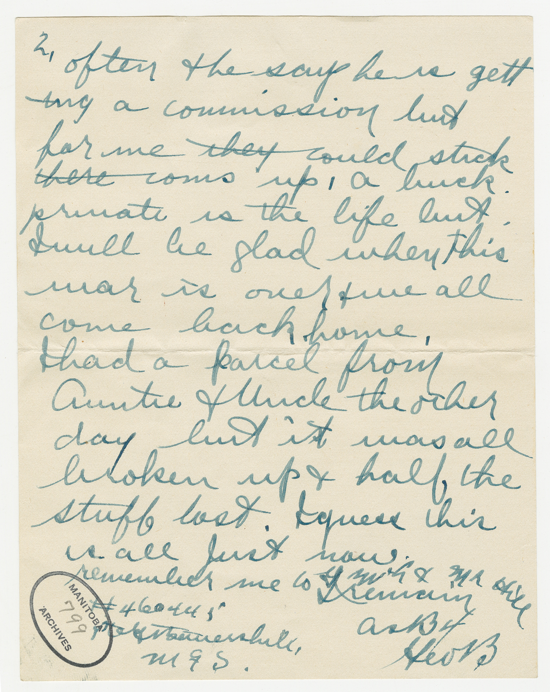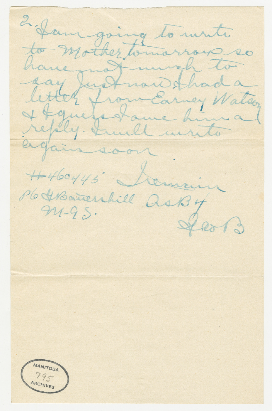 « I wish I was over in Eng[land] now Charlie is over + we both could go down to see Uncle + Auntie. I am expecting another parcel tonight from Auntie + hope it comes. You can give Dad a hint to send some good cigars as they go better than 20 cigarettes. »