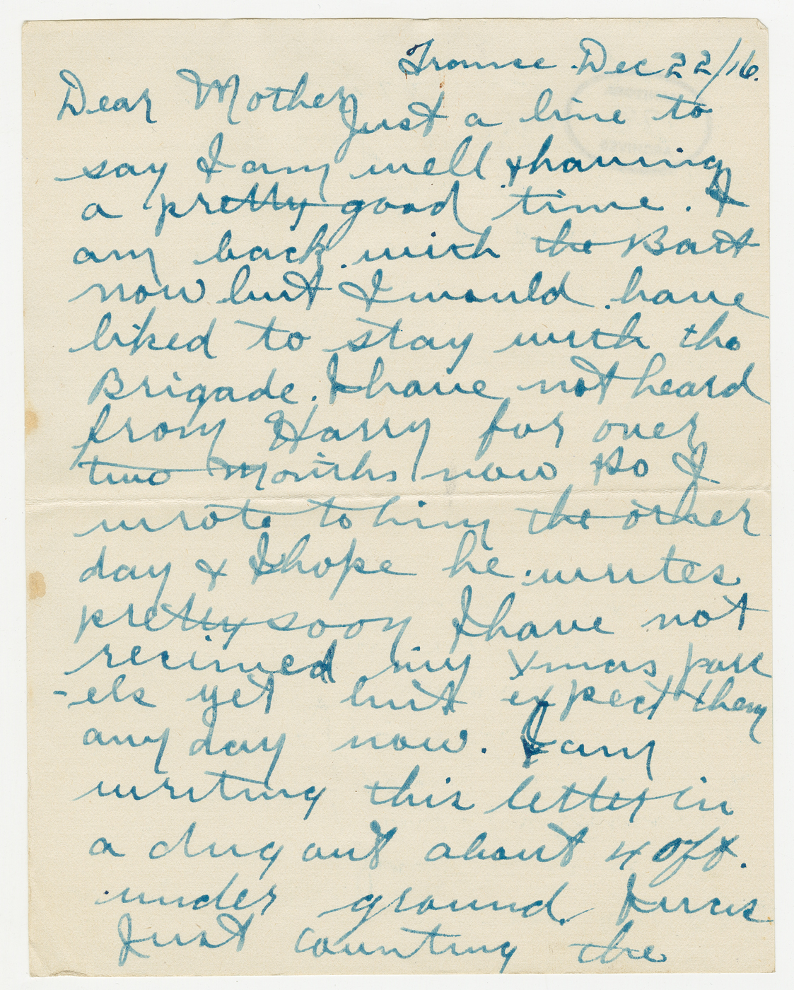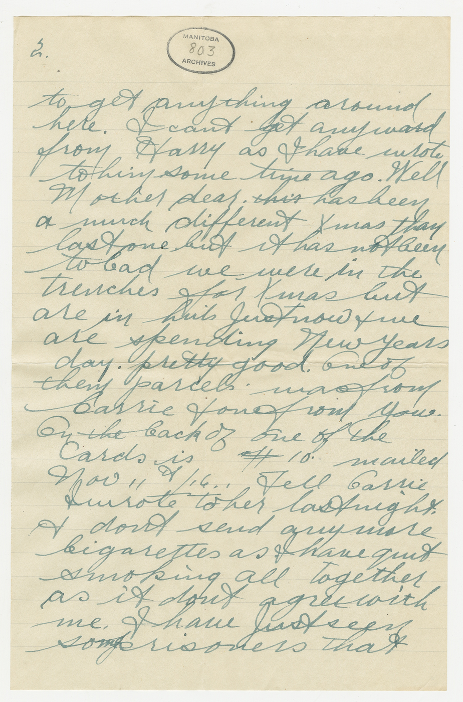 « Well Mother dear, this has been a much different Xmas than last one but it has not been too bad. We were in the trenches for Xmas but are in huts just now + we are spending New Years Day pretty good. One of them parcels was from Carrie + one from you. On the back of one of the cards is #10 mailed Nov. 11th/16. Tell Carrie I wrote to her last night + don’t send any more cigarettes as I have quit smoking all together as it don’t agree with me. I have just seen some prisoners that the 42 took last night. We had some time on Xmas day. The Germans came over in bunches + gave us cigars + beer. For dinner today I had 4 eggs, 1 can corn + 1 can beans. Not too bad (ah what). Well Mother Dear I guess this is all just now. »