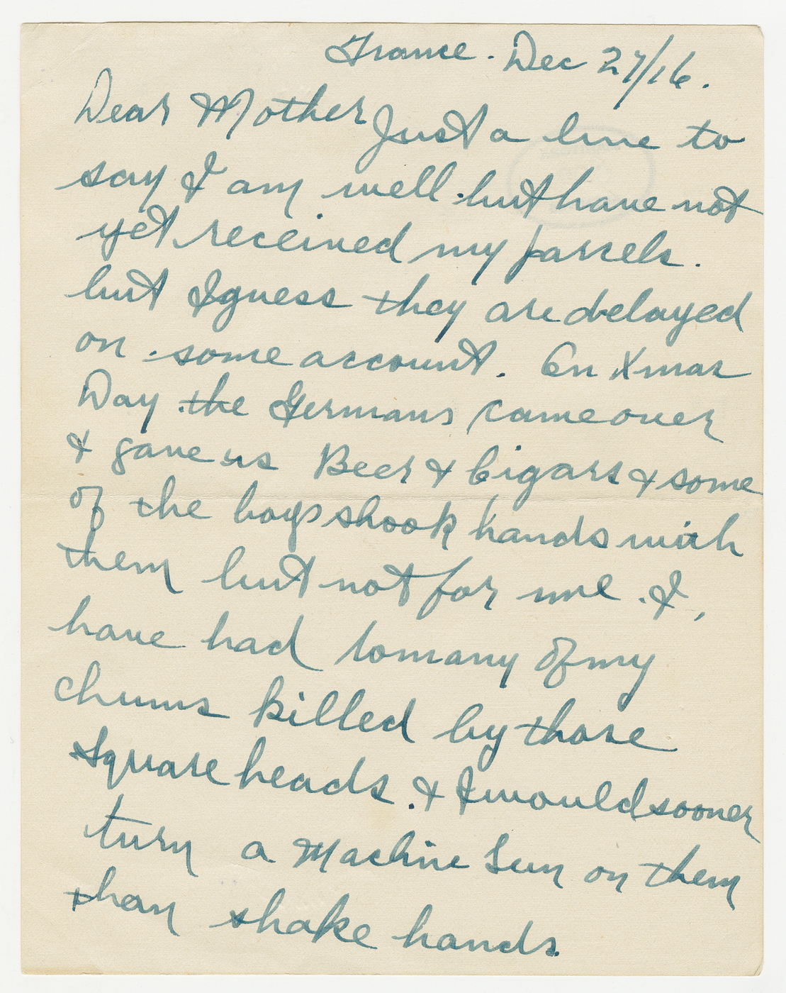 « On Xmas Day the Germans came over + gave us beer + cigars + some of the boys shook hands with them, but not for me. I have had many of my chums killed by those square heads + I would sooner turn a machine gun on them than shake hands. »