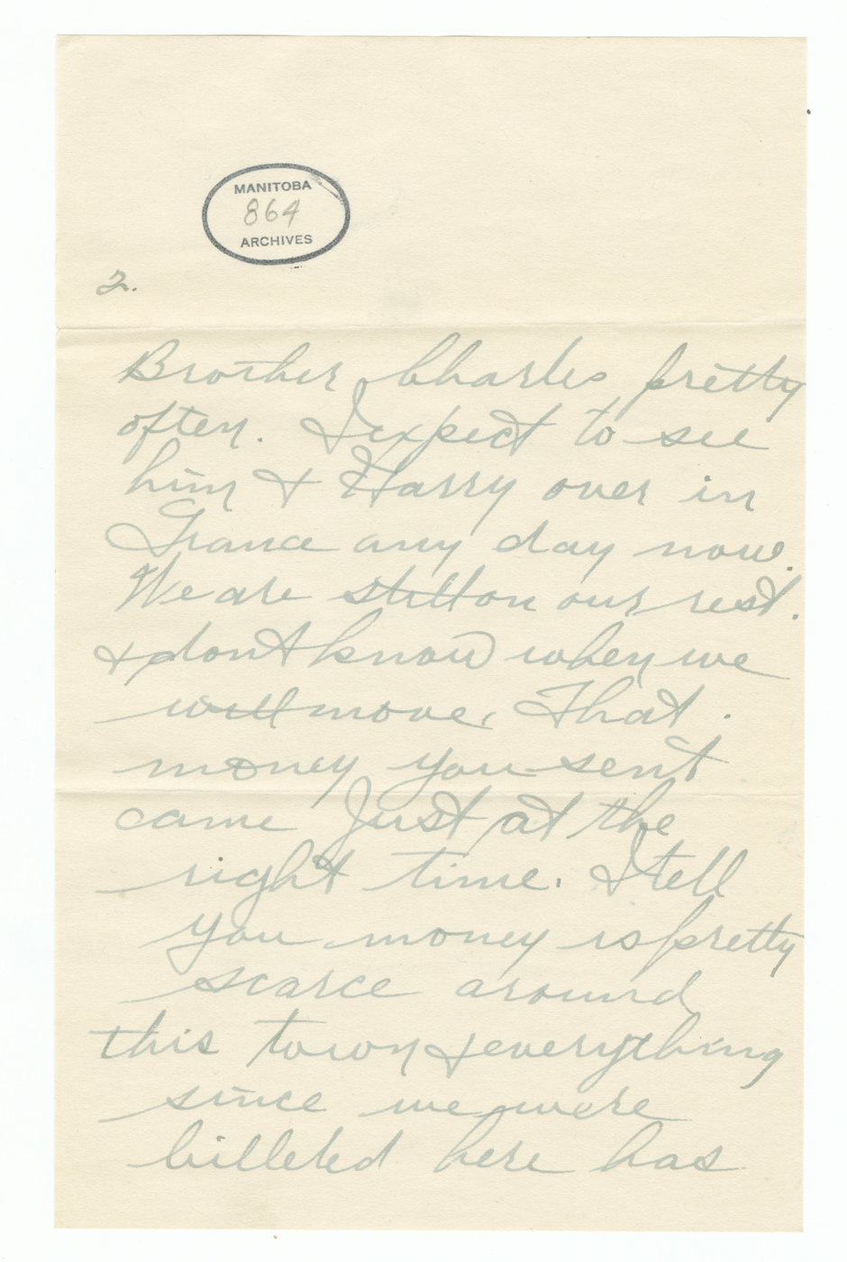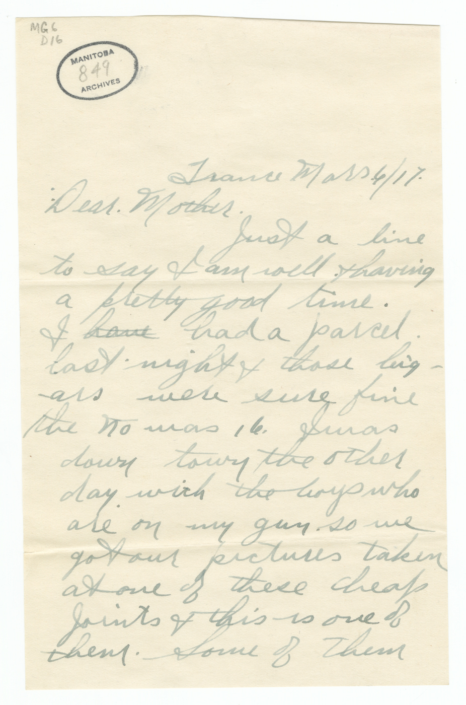 Dans cette lettre, George écrit à sa mère qu’il est encore dans la ville française où il se trouve depuis quelques semaines. Il s’attend à ce qu’ils soient déplacés sous peu. Il est fort possible que George participe alors aux préparatifs de la crête de Vimy.
