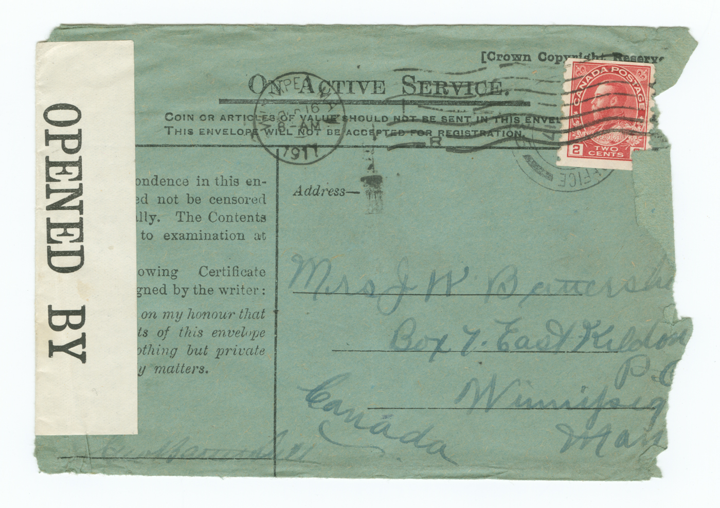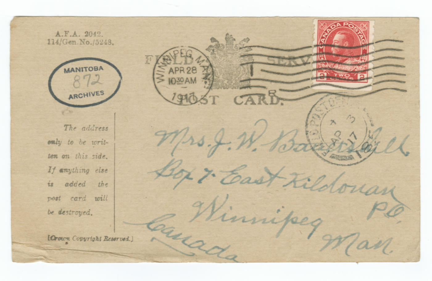 La carte a été estampillée à East Kildonan le 30 avril, treize jours après la mort de George en France. (George a été blessé à la crête de Vimy et est mort de ses blessures le 17 avril 1917. Les blogues du mois prochain contiennent plus de détails à ce sujet.)