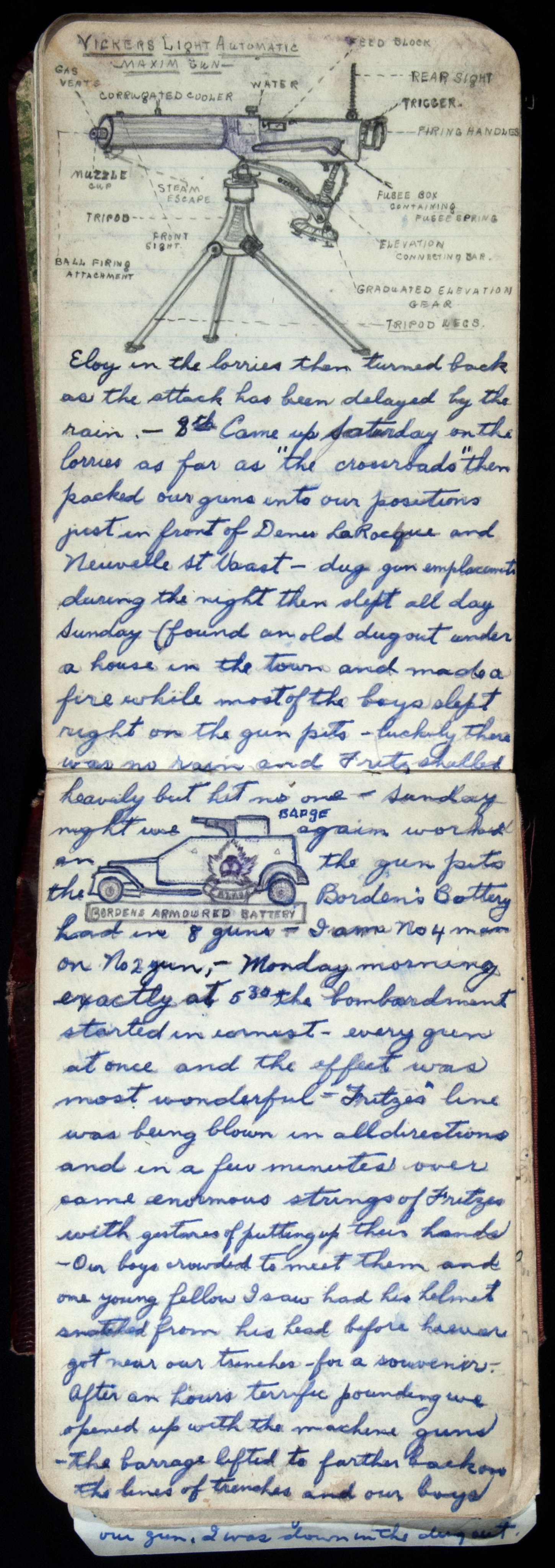 « Monday morning exactly at 5:30 the bombardment started in earnest – every gun at once and the effect was most wonderful – Fritzes’ line was being blown in all directions and in a few minutes over came enormous strings of Fritzes with gestures of putting up their hands – our boys crowded to meet them and one young fellow I saw had his helmet snatched from his head before he even got near our trenches – for a souvenir. After an hours terrific pounding we opened up with the machine guns – the barrage lifted to farther back on the lines of trenches and our boys came streaming across the top mostly in a leisurely happy humour – possibly due to their rum. We could see thousands of men as far as eye would reach on the rolling ground all headed in one directions walking leisurely enough with their rifles slung on their shoulders and their long hungry looking bayonets protruding above their heads. »