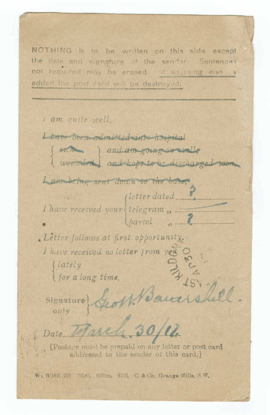 La correspondance de cette semaine ne comprend qu’une carte postale en service actif (aussi appelée carte postale whiz bang) envoyée par George à sa mère le 30 mars 1917. George utilise la carte postale pour dire qu’il va bien et qu’il a reçu une lettre et un colis.
