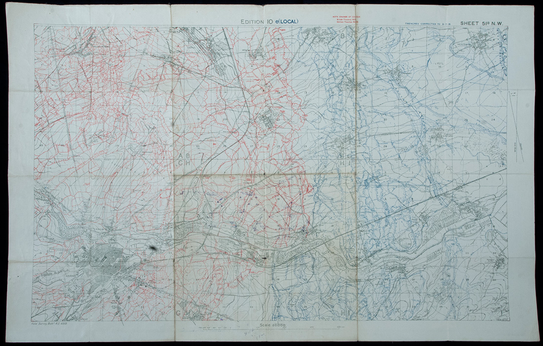 Il est intéressant de noter que les couleurs utilisées pour signaler les tranchées allemandes et britanniques ont changé au début de 1918. Les tranchées britanniques qui étaient bleues sont devenues rouges (comme dans les deux premières cartes au-dessus), tandis que les allemandes qui étaient rouges sont devenues bleues. Un avertissement de ce changement figure sur la quatrième carte ci-dessous :
