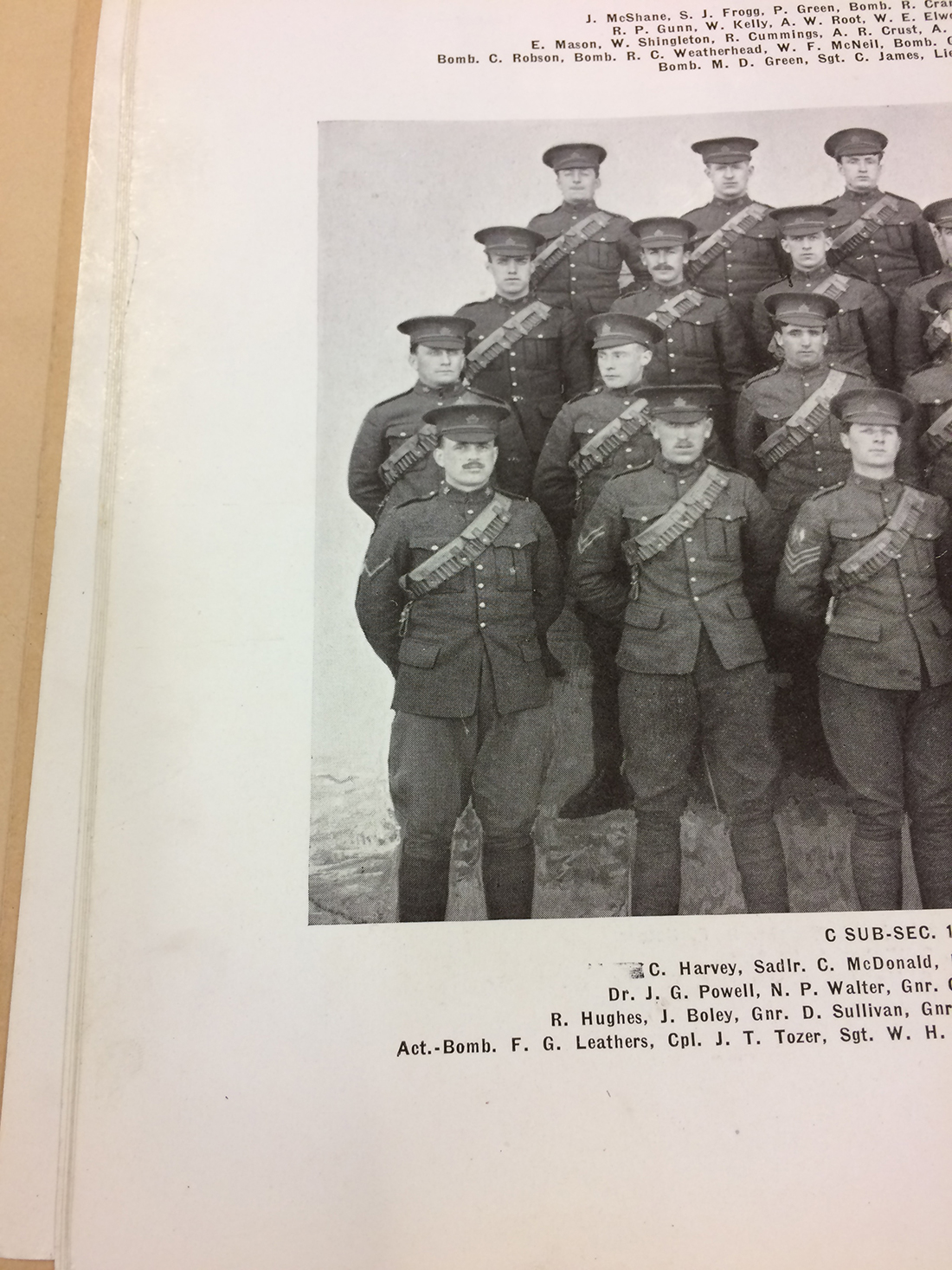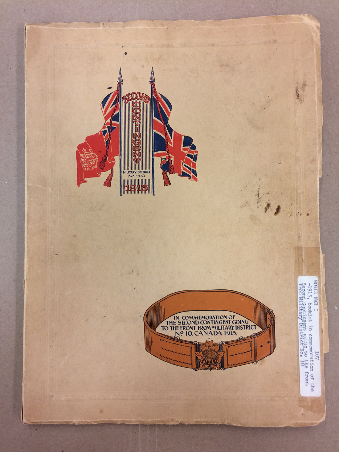 À l'occasion du 100e anniversaire de la Première Guerre mondiale, nous concentrons notre travail de description sur les dossiers de cette guerre. Un des articles que nous avons récemment décrits dans notre base de données en ligne, Keystone, est un livret souvenir sur le départ du deuxième contingent du district militaire no 10 pour le front de la Première Guerre mondiale en 1915. Le titre complet est « Second Contingent, Military District No. 10 1915: In commemoration of the Second Contingent going to the Front from Military District No. 10 Canada 1915 ». Le livret contient des photographies d'officiers supérieurs ainsi que des photographies de groupe de nombreux membres du personnel, des batteries, des sections, des compagnies, des groupes-bataillons et des brigades dont la 6e brigade d'infanterie, la 5e brigade d'artillerie, le 27e bataillon, le 28e bataillon, le corps d'intendance de l'armée et la 4e ambulance de campagne. Toutes les photographies portent le nom des personnes. Le livret comprend également une introduction rédigée par le maire de Winnipeg, R.D. Waugh, et de nombreuses annonces pour des entreprises winnipégoises de l'époque.