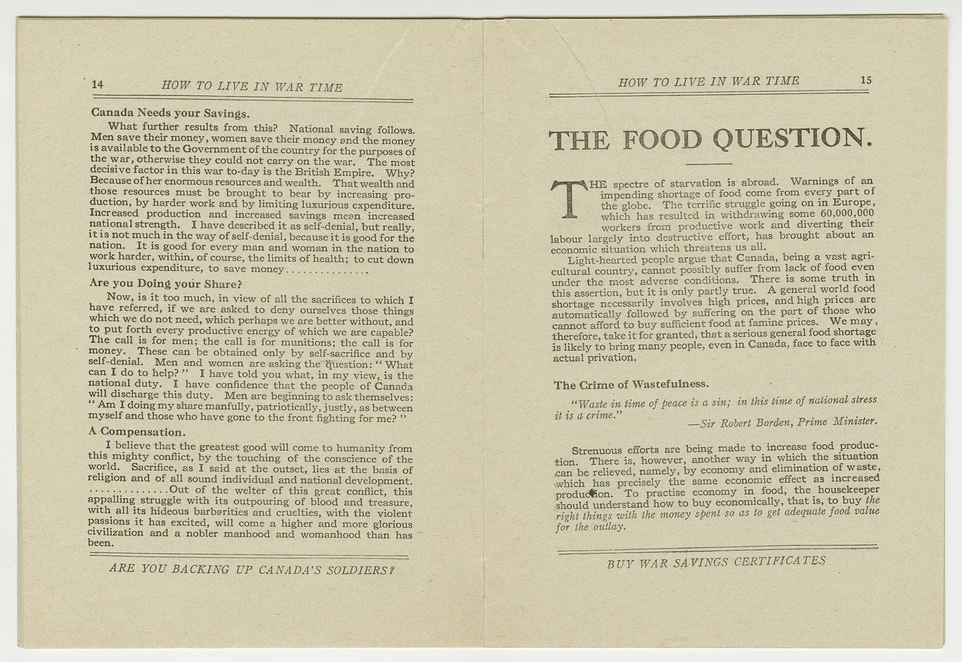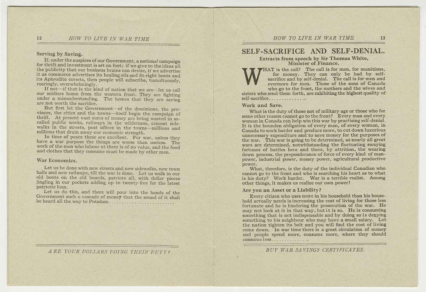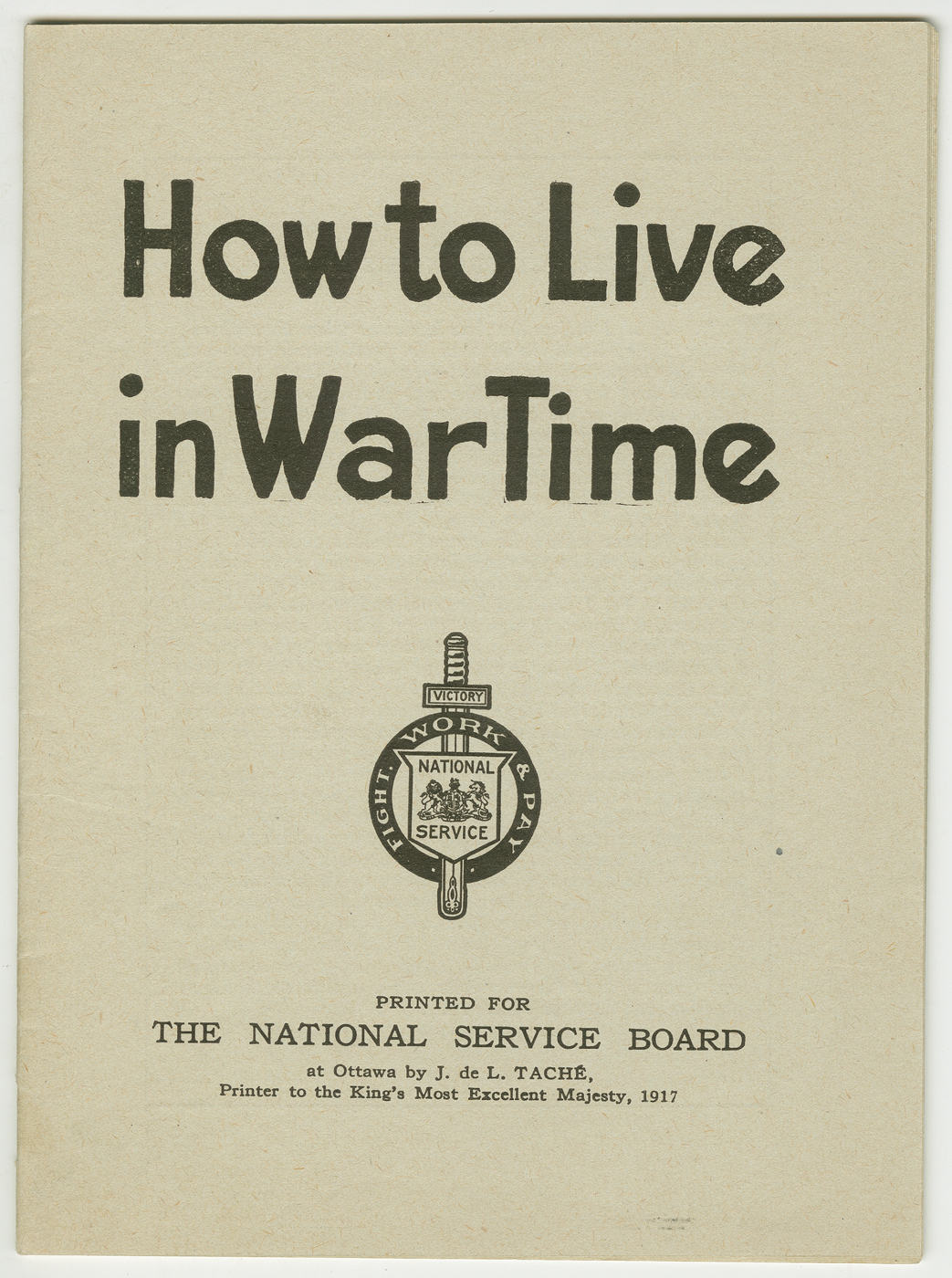 La brochure figurant ici est l'un des articles inclus dans les dossiers de Gertrude Code. Elle est intitulée « How to Live in Wartime » et a été publiée par la Commission du Service national en 1917. Elle comprend un message du premier ministre, M. Robert Borden, des extraits d'un discours du ministre des Finances de l'époque, Sir Thomas White, intitulé « Self-Sacrifice and Self-Denial », ainsi qu'un message du Contrôleur des Vivres, W.J. Hanna, qui encourage les Canadiennes à faire leur part :