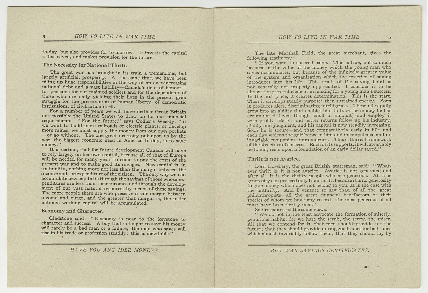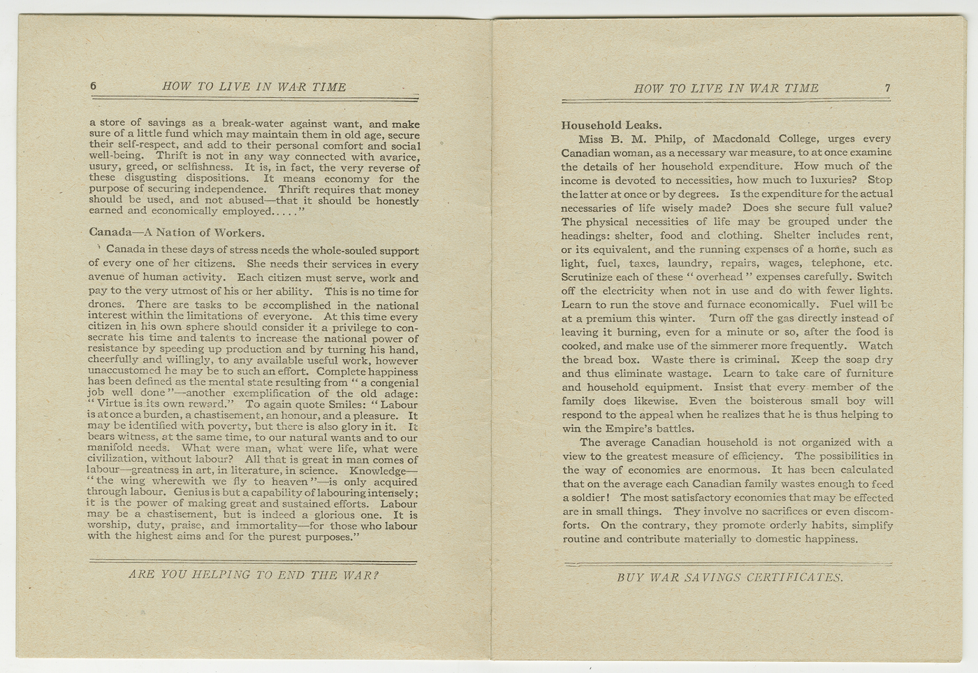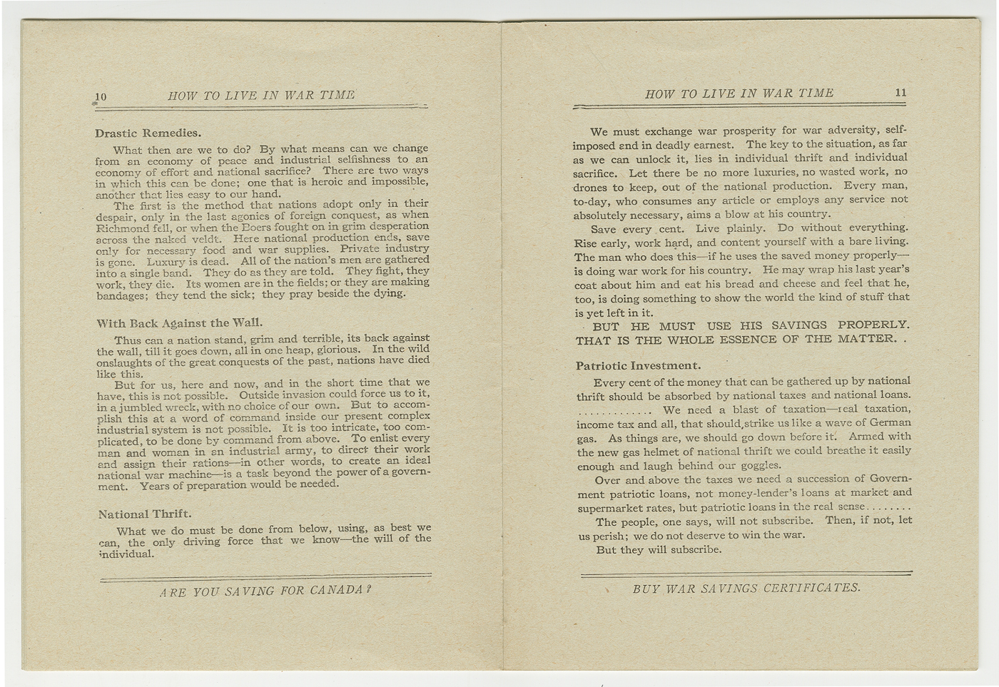 La brochure figurant ici est l'un des articles inclus dans les dossiers de Gertrude Code. Elle est intitulée « How to Live in Wartime » et a été publiée par la Commission du Service national en 1917. Elle comprend un message du premier ministre, M. Robert Borden, des extraits d'un discours du ministre des Finances de l'époque, Sir Thomas White, intitulé « Self-Sacrifice and Self-Denial », ainsi qu'un message du Contrôleur des Vivres, W.J. Hanna, qui encourage les Canadiennes à faire leur part :