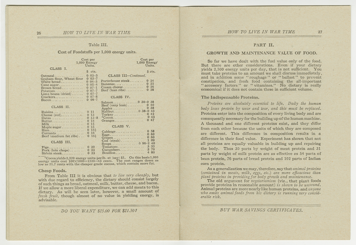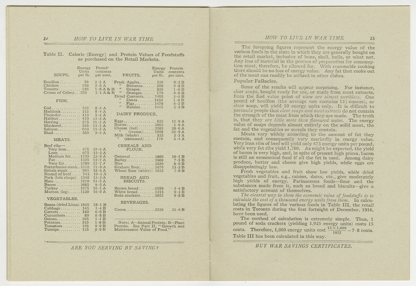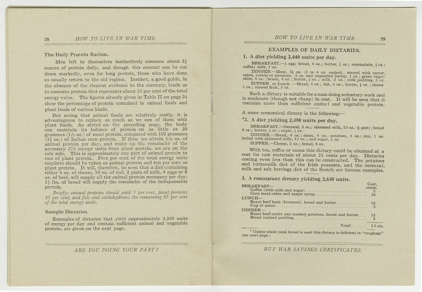 La brochure donne également des renseignements sur l'économie alimentaire y compris un tableau des exigences caloriques, des exemples de plans de repas et de l'information sur « indespensible proteins », « cheap foods » et « roughage ».