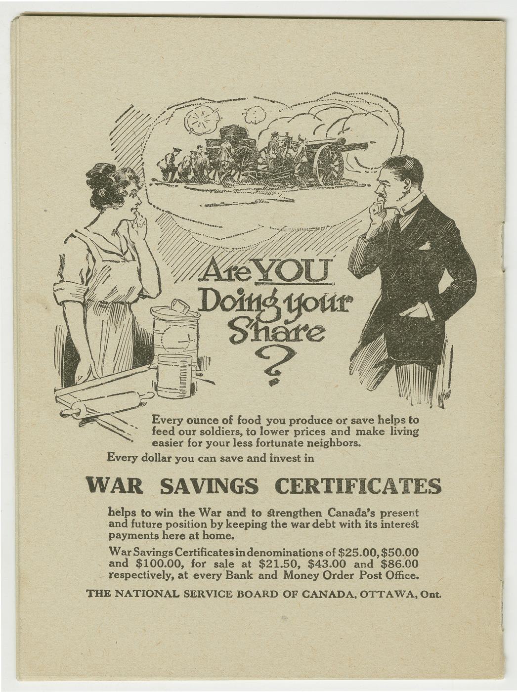 “…Each housewife can render this valuable National Service within her own home and in doing so, she helps not once, but thrice. She will “do her bit” in augmenting the food resources available for the boys overseas; with her savings she will be able to help Canada finance the war and, thus, incidentally, fortify the family position in meeting any after-the-war stress and, lastly, by restricting demand, she will automatically assist less fortunate families to buy food at lower prices. Surely no Canadian woman, however affluent her circumstances, can lightly dismiss responsibilities of so grave a nature.”