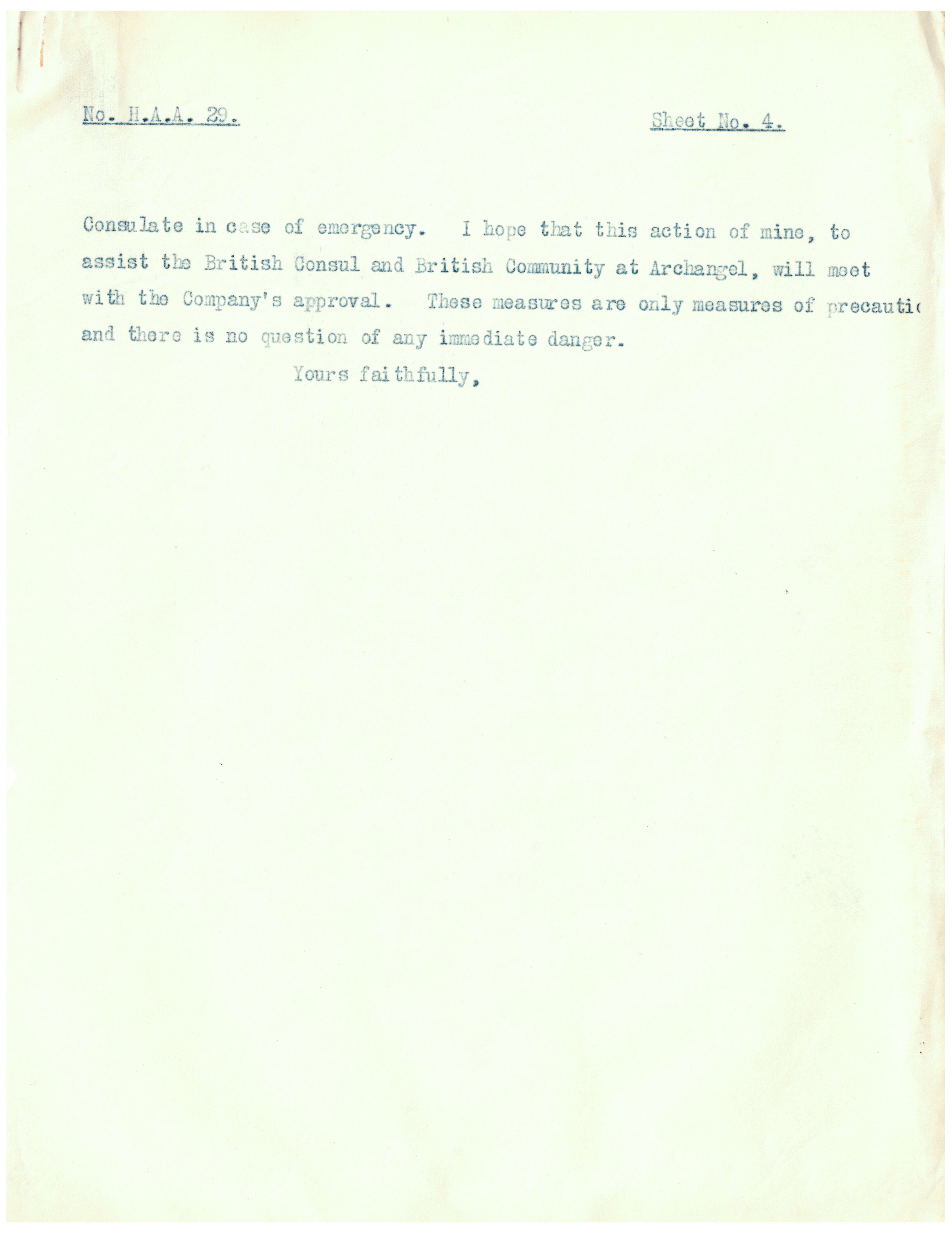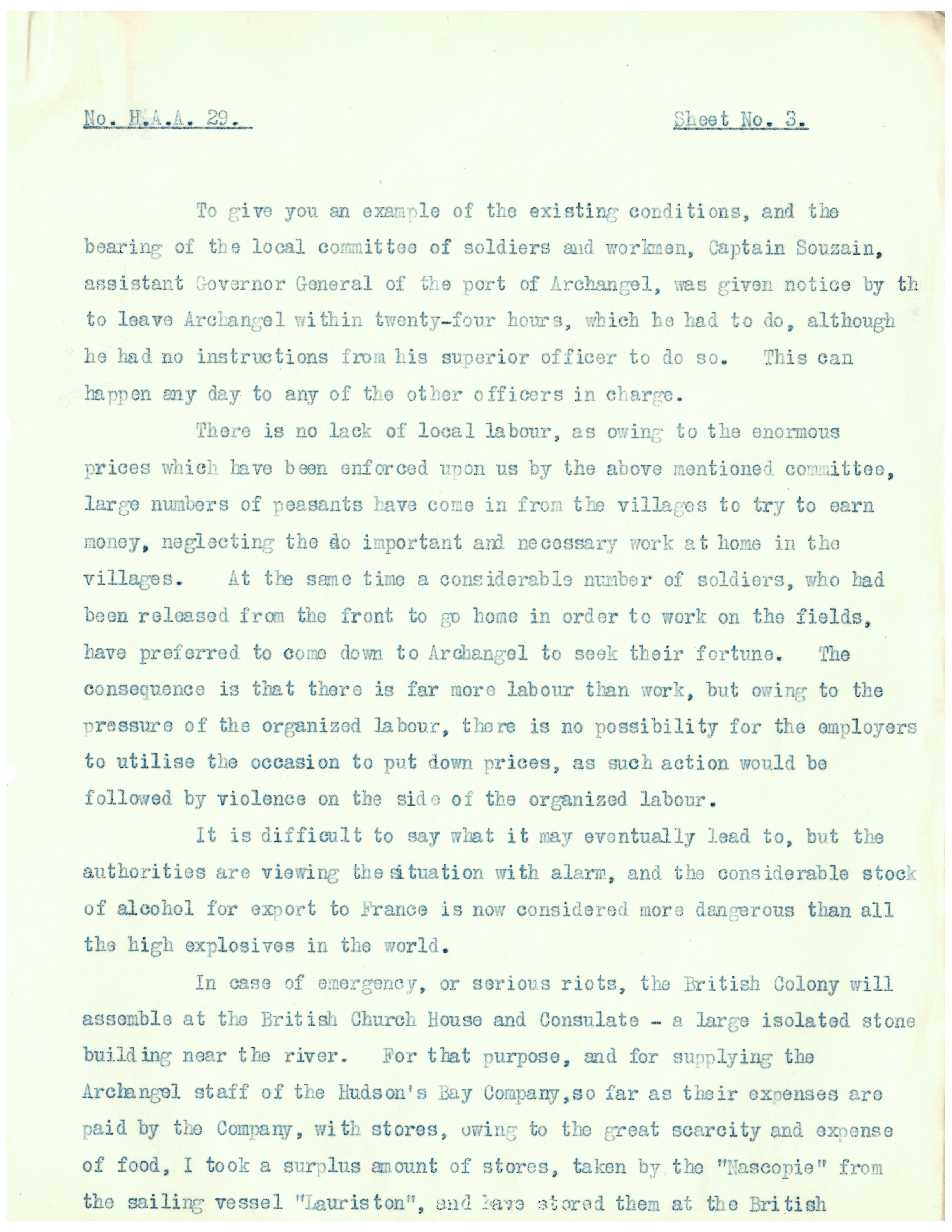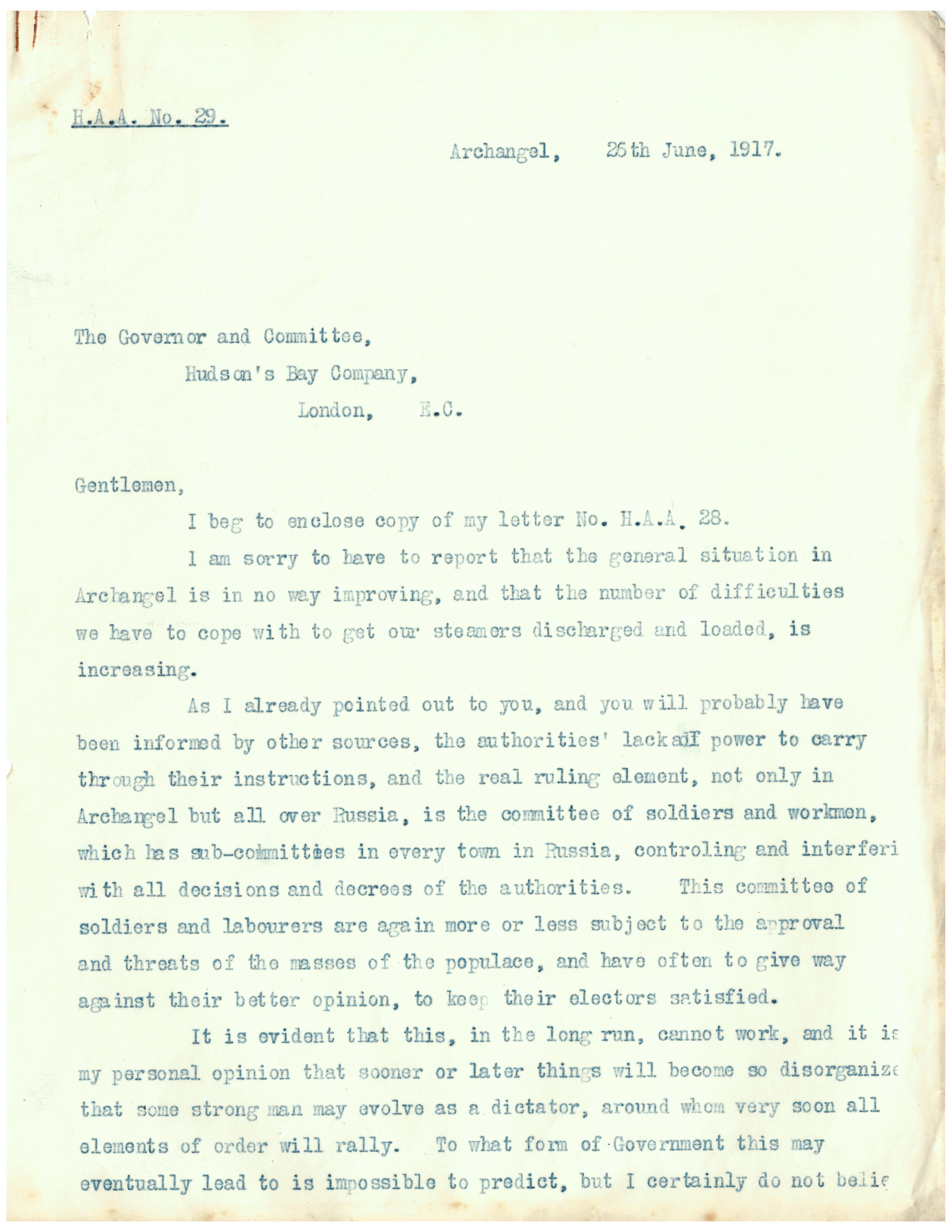 En 1917, la Compagnie de la Baie d'Hudson s'est retrouvée au premier rang de la révolution en Russie, en raison de ses contrats de transport en temps de guerre avec divers pays européens. La présente lettre, datée du 25 juin 1917, a été écrite par H.A. Armistead, l'agent de la Compagnie de la Baie d'Hudson à Arkhangelsk, en Russie, et était adressée au gouverneur et au comité à Londres.