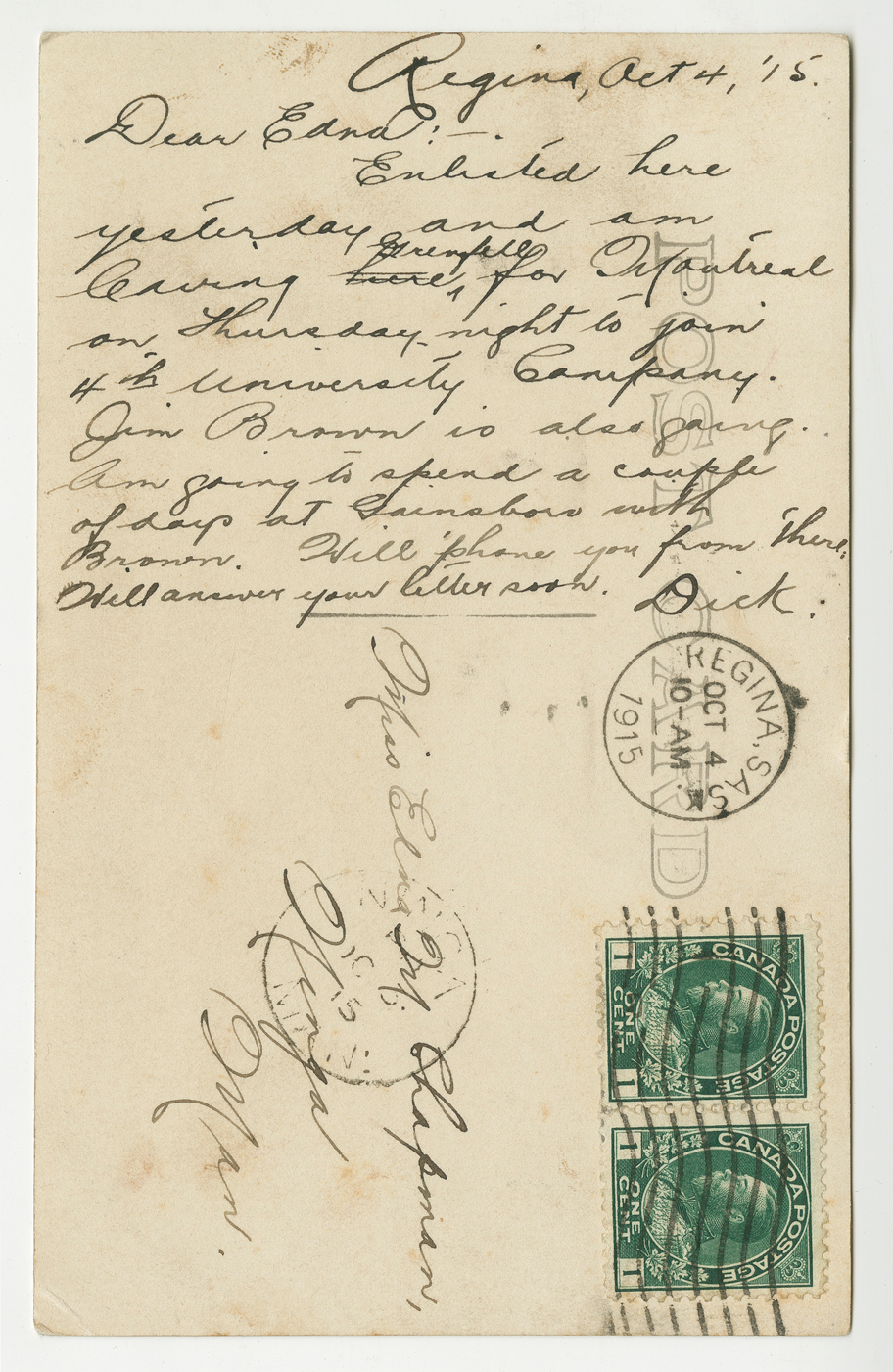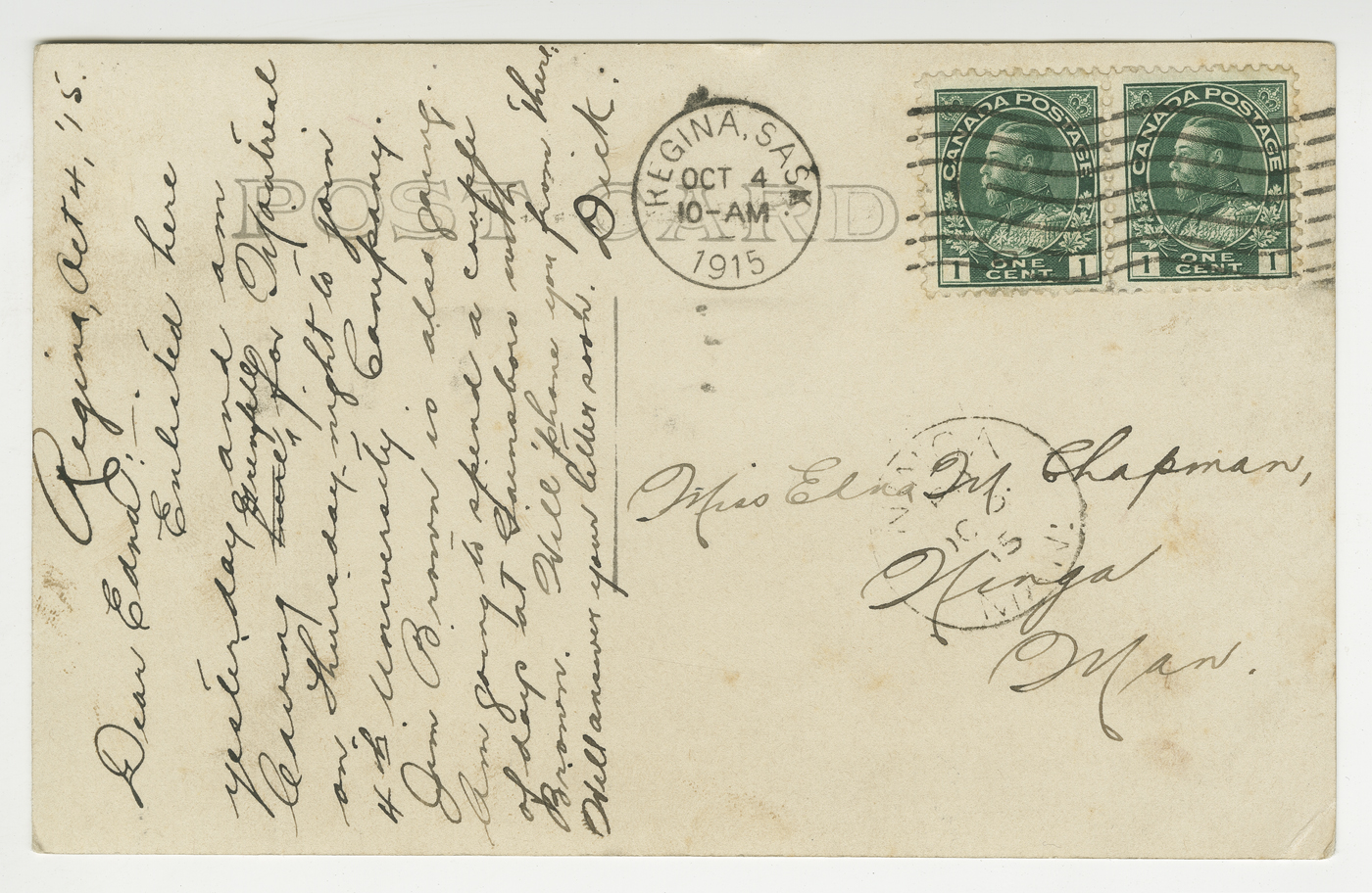 La carte postale a été envoyée le 4 octobre 1915 par Charles Douglas (Dick) à Edna Chapman, pour lui signaler qu’il s’était enrôlé la veille au Camp Sewell.