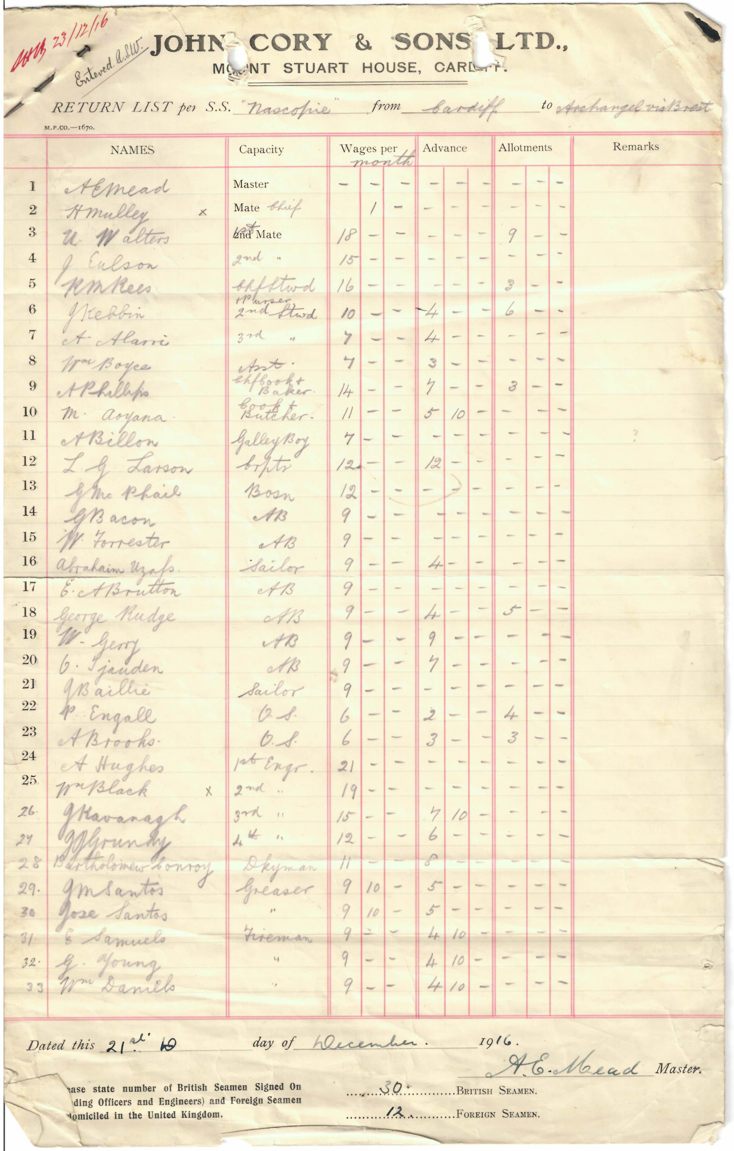 Les documents d’archives de Sale & Co. sont surtout composés de correspondance entre l’entreprise et le gouverneur et comité de la Compagnie de la Baie d’Hudson portant sur les conventions d’achat de navires, les assurances et des questions liées à des navires en particulier. Ces documents contiennent également des rôles d’équipage, dont celui-ci pour le Nascopie qui est daté de décembre 1916 :