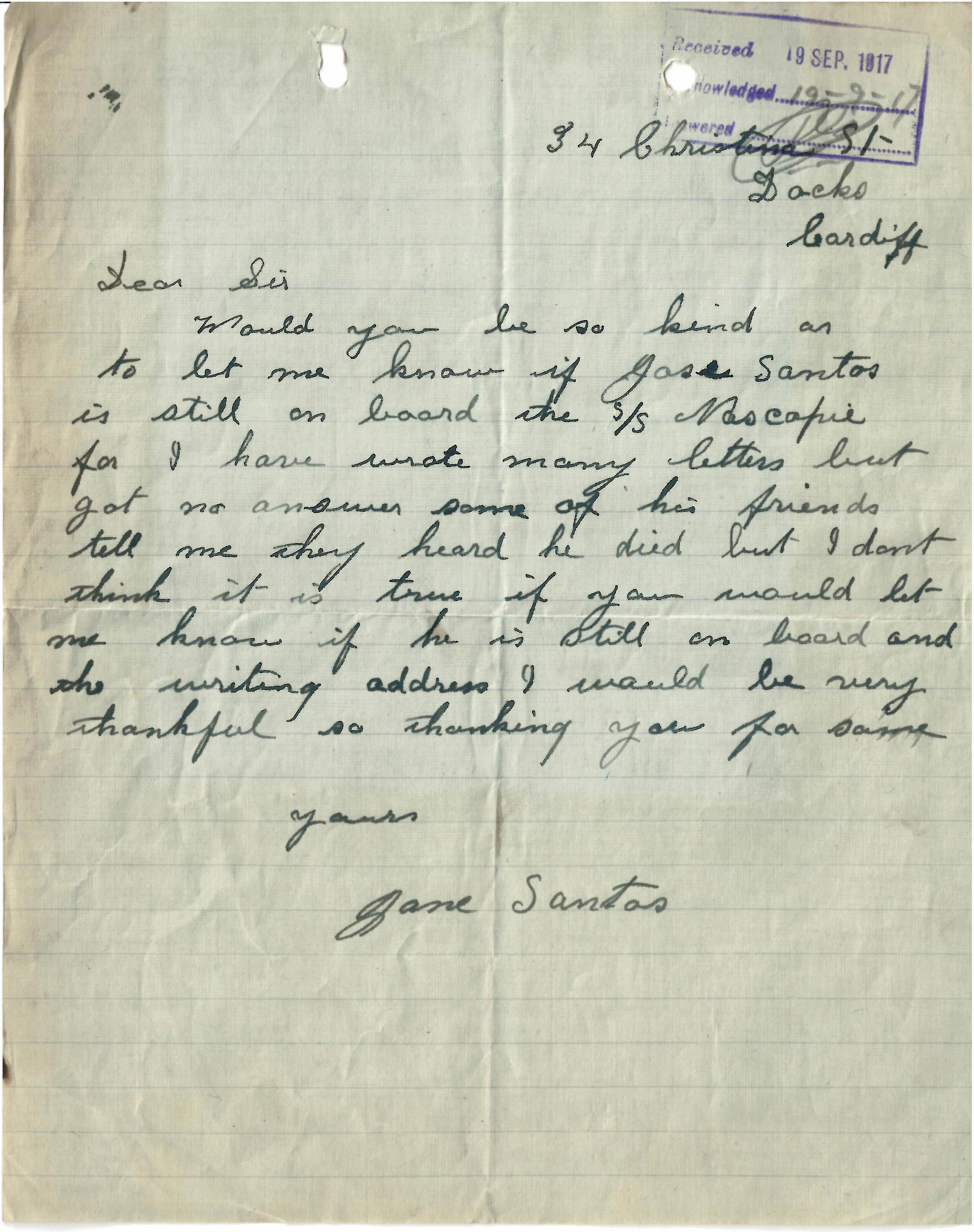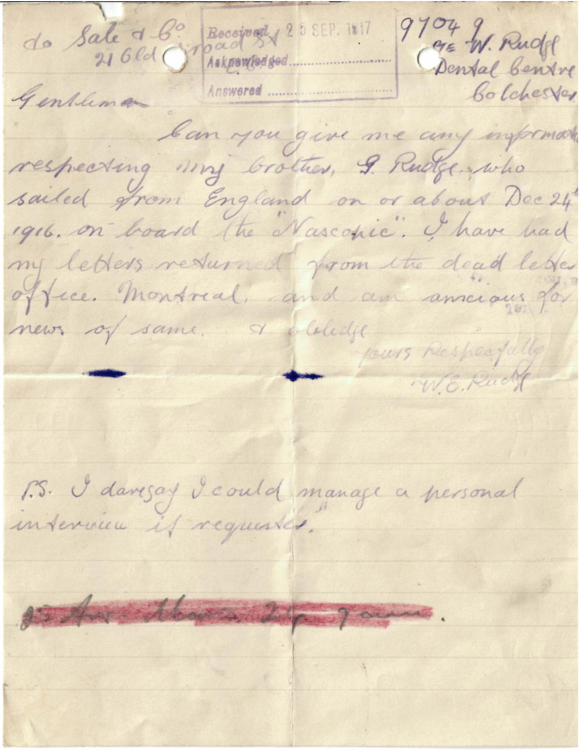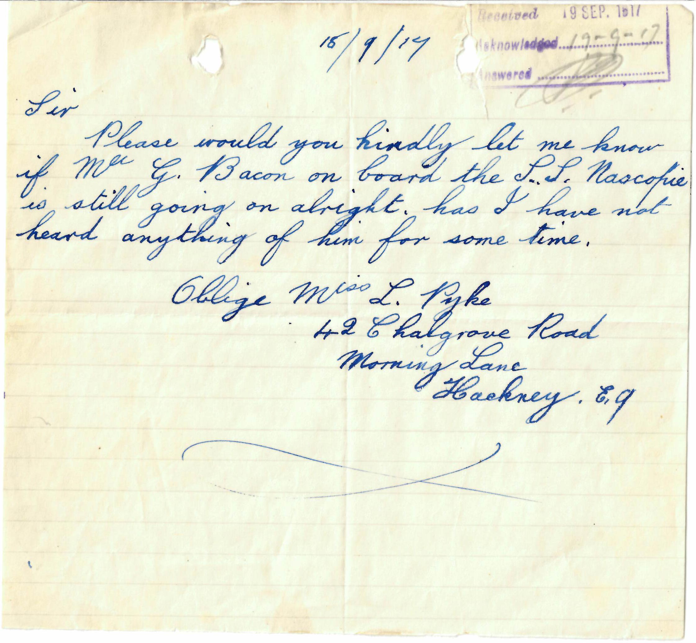 En septembre1917, le bureau de Sale & Co. a reçu trois lettres de membres de la famille des membres d’équipage du Nascopie. Les trois auteurs des lettres s’informaient tous de leurs êtres chers puisqu’ils n’avaient pas eu de nouvelles d’eux depuis longtemps.