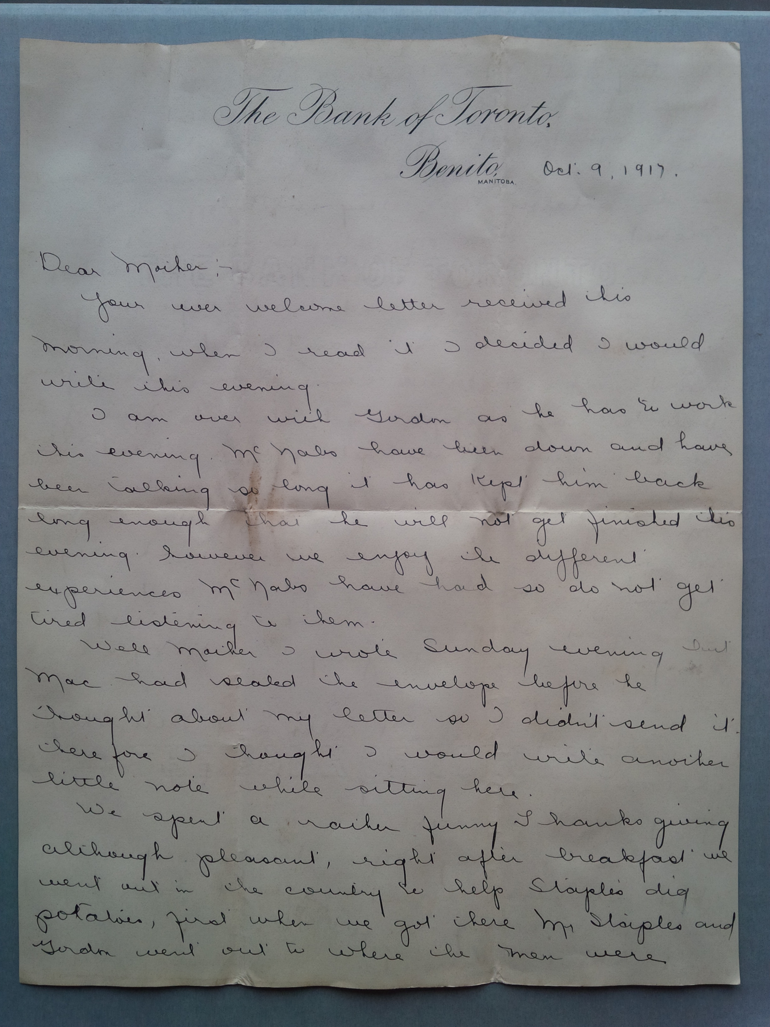 Kate McKittrick est déménagée de l’Ontario à Benito, au Manitoba, pendant l’été 1917 lorsqu’elle a épousé Gordon McKittrick. Leurs lettres adressées à la famille de Gordon ont été trouvées dans le grenier d’une maison de Thornbury, en Ontario, et ont été données aux Archives du Manitoba en 1964.