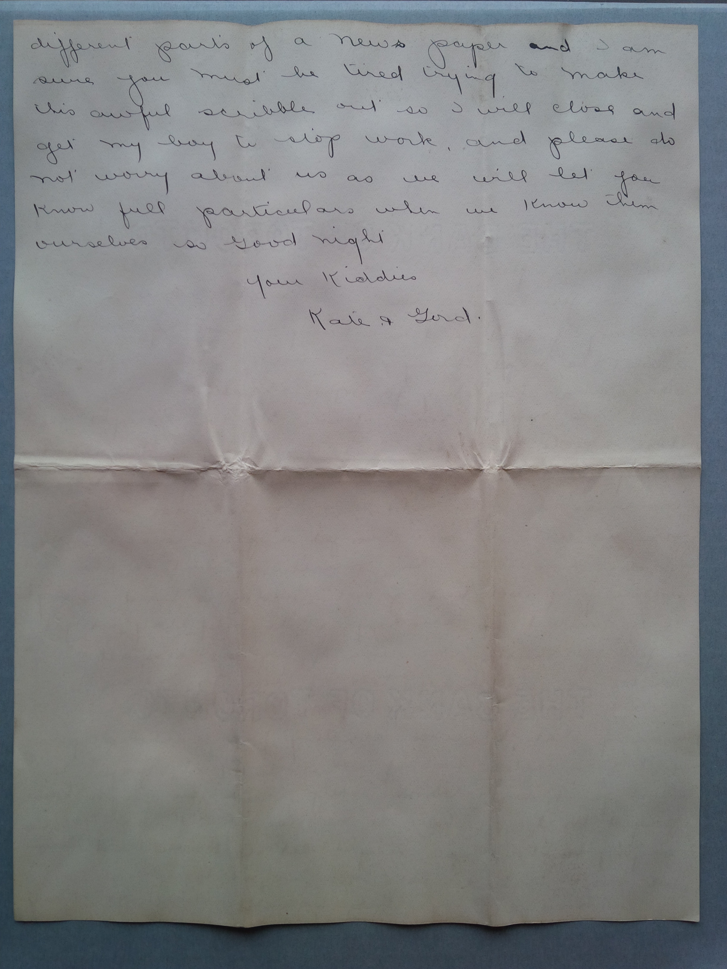 À ce moment-là, les McKittrick attendaient avec anxiété de voir si Gordon allait être appelé à servir dans la Première Guerre mondiale. Dans la même lettre, Kate a décrit leurs plans si cela se produisait :