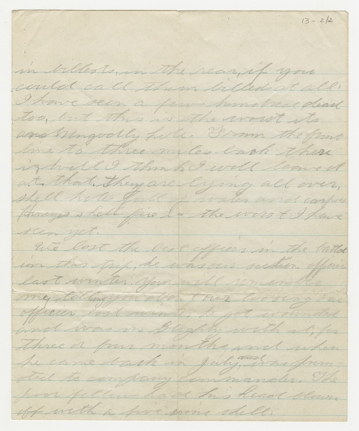 « We have just completed a few days ago, one of the worst trips in the lines since I have been in France. I have seen and been in some dirty holes in this country but this was the worst… I thought I had seen a few thousand guns while I have been in France but have never seen the mass of guns there are in this place and the incessant bombardment. The country is a big jelly pot of wet mud and water shaking or rather quivering under the fire of the guns. There are planes in thousands and I give Hinies planes their due, they come over in bunches of dozen or so and drop bombs and use their machine guns on both the troops in the line and in billets in the rear, if you could call them billets at all. I have seen a few hundred dead, too, but this is the worst it's an ungodly hole. From the front line to three miles back there is hell I think I will leave it at that. They are lying all over, shell holes full of water and corpses[.] Hineys shell fire is the worst I have seen yet. »